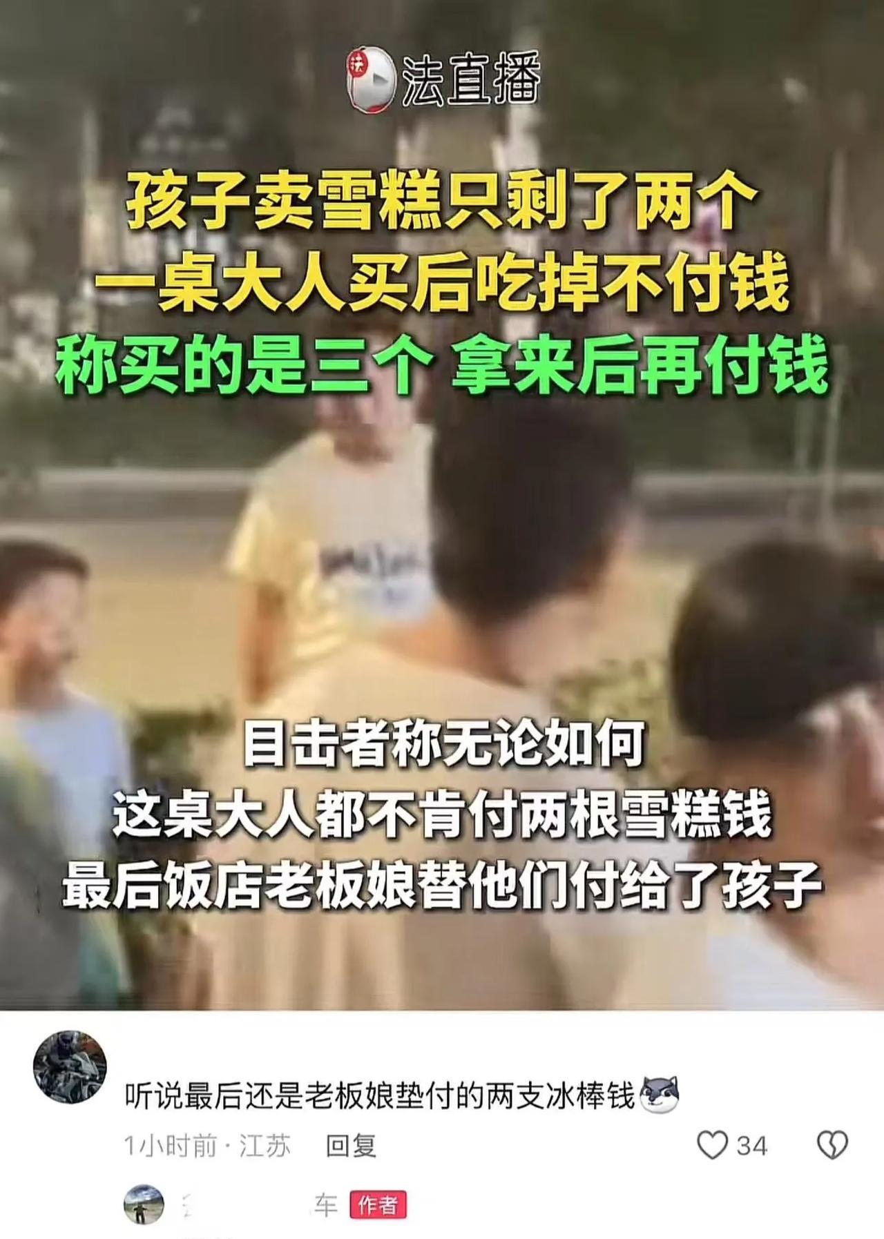 “男人的脸都被丢光了!”贵州瓮安,3个小孩子在路边卖冰棍,一桌吃烧烤的大老爷们吃了冰棍居然不付钱!他们说点了3根,但小朋友只有2根,必须想办法再拿一支。路人都看不下去了,冲上就想干他们!网友:低了一辈子的头,终于在小孩面前抬起来了! (来源:法直 播) 三个小朋友非常懂事,大热天出去沿街叫卖冰棍,一直卖到晚上,想着把剩下的2根冰棍给卖完再回家。 “卖冰棍了,卖冰棍了……” 当他们路过一个烧烤摊时,看到不少人正围坐着吃烧烤,于是更加卖力地吆喝起来。 这时,旁边一桌正在吃烧烤的男子朝他们招了招手,声称要给他们来3根冰棍。 小朋友们告知对方只有两根了,而这桌人直接打开那两根冰棍吃了起来,吃完后却丝毫没有要付钱的意思,还厚颜无耻地要求小朋友必须想办法再拿一根冰棍过来,因为他们点了3根。 小朋友们哪里会想到大人竟然会如此耍无赖,他们焦急又无奈地解释说回去拿冰棍路途遥远,不过可以去附近的超市代买一根,成本3元,给2块的跑腿费,可这一桌男人却依旧蛮不讲理地不同意。 小朋友们孤立无援,实在没有办法,只好选择把警察叔叔喊来。 然而,在警察叔叔面前,这一桌人不但没有丝毫的收敛,态度反而更加嚣张,依旧拒不买单。 这时,一个路过的大哥实在看不下去了,怒火中烧地冲上去想教训他们,好在被周围的人及时拉住了,才避免了一场冲突。 据围观的人说,最后是烧烤摊的老板娘看不过去,付了钱,小朋友们才得以离开。 不过官方回应称,当另一个小朋友送冰棍过来时,民警也及时赶到了,第三只冰棍给了购买者后,对方付了钱,小朋友们收到钱后就离开了。 此事引发了热议, 有网友说,这种行为不算寻衅滋事吗,叔叔这么宽容?小朋友的人生第一课,“叔叔也不是全能的!” 也有网友说,连小孩的便宜都占?而且冰棍才几块钱呀?活不起了吗?丢人丢到家了!真是活久见! 还有网友说,这几个男的真是把祖宗的脸也丢尽了,视频传怎么有脸出去见人? 这么炎热的天,小朋友们顶着烈日卖冰棍,一直卖到晚上,赚那一点点微薄的冰棍钱容易吗? 在成人的世界里,我们本应成为孩子们的榜样,守护他们的纯真与善良,而不是用无赖和蛮横去浇灭他们心中的希望之火。 若连孩子都欺负,还谈何道德与良知?这不仅仅是对两个冰棍钱的逃避,更是对人性基本底线的践踏。#头号创作者激励计划#