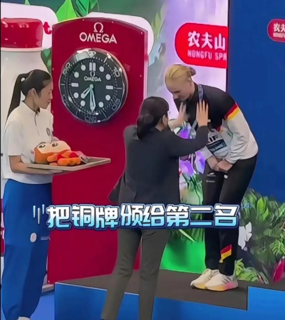 万万没想到,陈芋汐新加坡世锦赛夺冠火的却是周继红,这个游泳队的领导竟然颁奖都会颁错,真的是史无前例! 陈芋汐世锦赛10米跳台夺冠确实值得庆祝,周继红作为颁奖嘉宾或许是太高兴了,把银牌颁给了季军谢佩玲。 陈芋汐在旁边一直提醒,周大佬却将错就错又把铜牌颁给了亚军。 最后合照环节,在陈芋汐的极力沟通帮两人换回了各自的奖牌。 世锦赛颁奖如同儿戏,这足以说明一个人做事有没有原则性。试想一下,如果冠 军不是陈芋汐,那奖牌颁错的问题是否会扩大影响,真是丢脸丢到国外了。