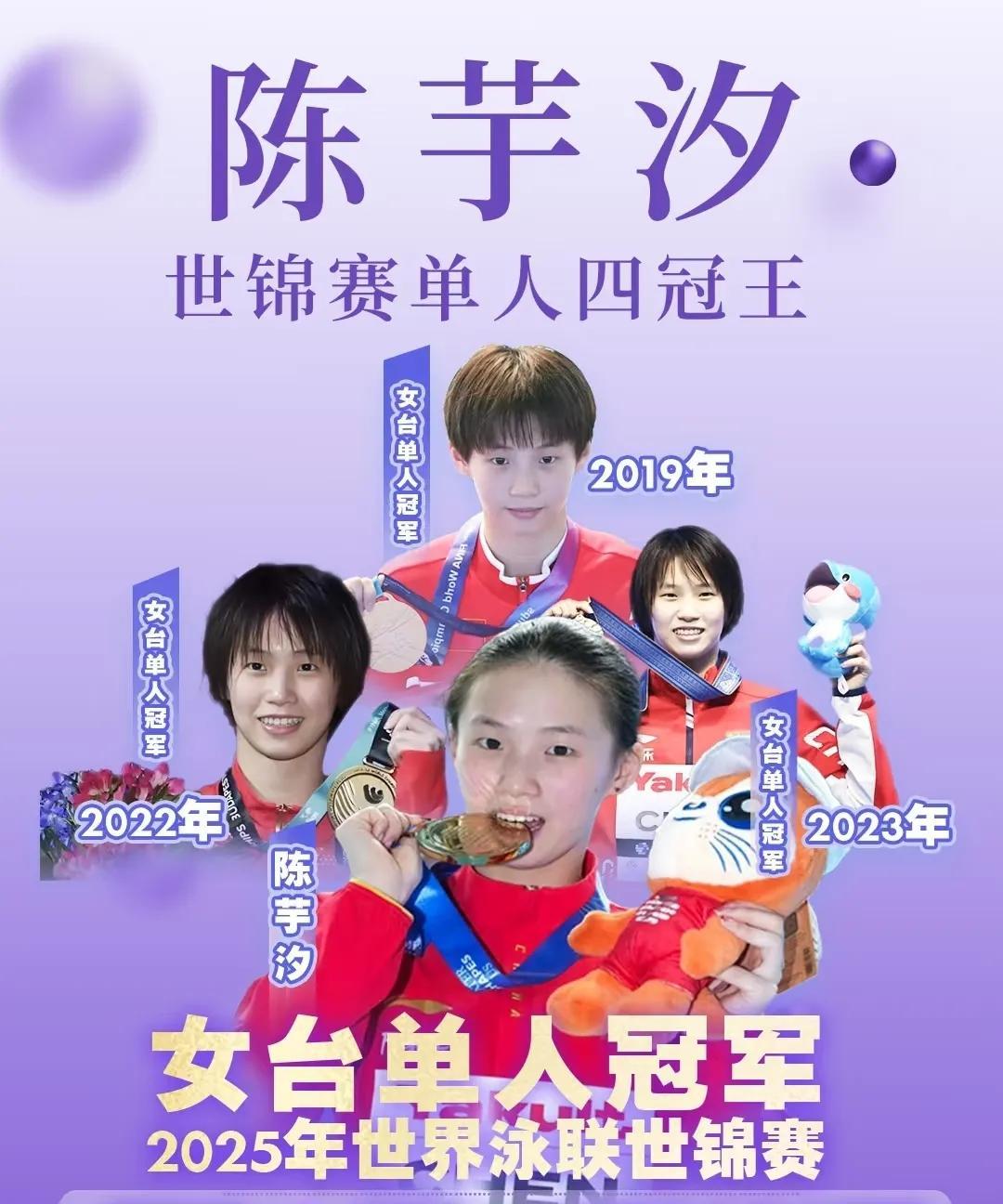 陈芋汐,20岁的跳水“老将”,本来以为状态会下滑,没想到稳得可怕。 今年赛季,世界杯包揽三站单人冠军,全国跳水冠军赛夺冠,这届世锦赛更是创造了历史! 单人四冠王,双人四连冠,混团夺冠,本届世锦赛三金王! 20岁了还能跳430+,超过第二名63.4分,真是女台逆生长第一人! “坚持必有所获”,一路走来很不容易,很强大的小女孩,恭喜陈芋汐又有新突破! #头号创作者激励计划#