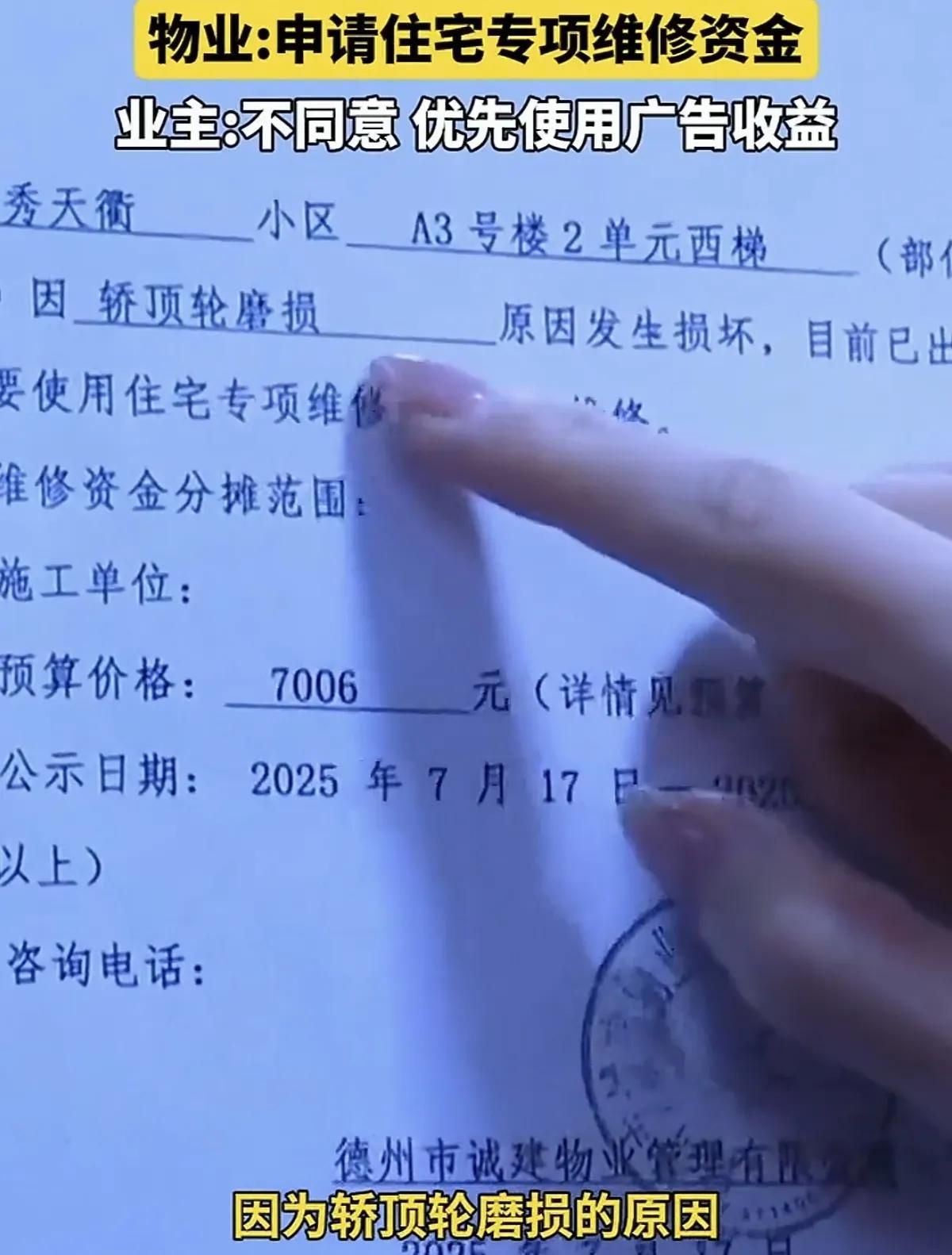 德州城北领秀天衢小区,一电梯损坏需要维修,小区物业准备动用维修基金,却遭到业主的一致反对,大家在申请表上都签了“不同意”的表决意见。 业主声称,维修电梯优先使用电梯广告收入。 广告是小区物业很大的一块收入,这些收入应该属于全体业主所有,那么除去正常的管理解用和合理抽成外,剩余的钱就应该用在小区公共事务上,而电梯维修应该属于公共设施,自然可以用广告收入来支付。 唉,物业或许会感叹,现在小区业主咋越来越不好糊弄了呢?