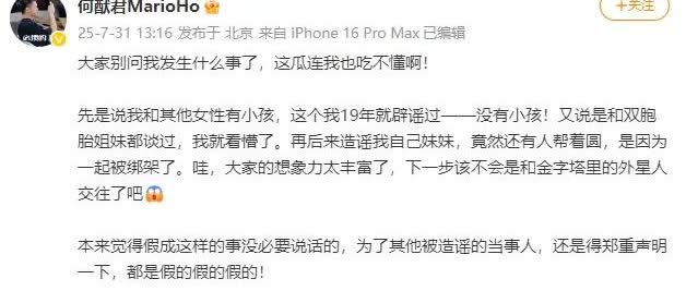 何猷君被传出轨,我不意外 何猷君被传骨科,我也不意外 但看到何猷君的辟谣声明,我太意外了! 这辟谣声明写得跟报菜名似的,把所有瓜都列一遍,不知道的还以为他在总结年度八卦呢, 那些造谣的人也不知道咋想的,有这想象力,不去写小说都可惜了,编出来的故事比电视剧还精彩。 这声明一发,等于给所有瓜盖了章“假的”,但估计还有人不信,毕竟瓜太上头了,不知道奚梦瑶看到这些谣言心里咋想,希望网友们以后吃瓜还是要理智点,别听风就是雨,没有实锤的事儿,就别到处传了。
