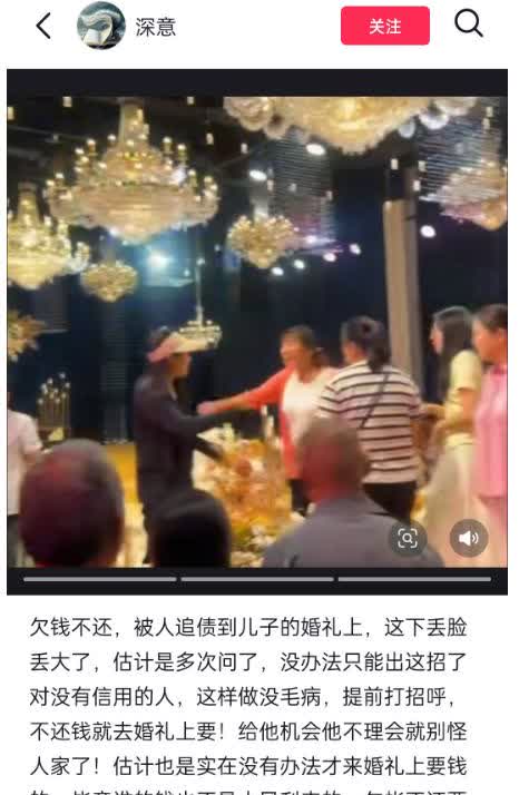 这女子太狠了!为了要账,大闹他人孩子的婚礼!她跪在婚礼舞台的中央,大声哭诉着,拉都拉不起来。一旁的亲友像看热闹一样,就连主持人都没见过这场面,一时间也语塞了。网友怒批:欠债还钱天经地义,没有过分的做法! 5月18日,网友发布图片可以看到,好好的婚礼现场,被借钱人这么一闹,双方亲友纷纷站起来看热闹,连新人也不关注不关心,只想知道女子为何要这么做? 网友解释道,能闹到孩子婚礼上,摆明是撕破脸不准备再来往了,但这能怪债主吗?如果不是欠债的像大爷一样,好话说尽都赖着不还钱的话,估计女子不会做的这么绝! 而且闹这么一场,正好能让女方家长和亲友都看看,这家人的素质就是欠钱不还,他们还能放心把女儿嫁进去吗? 不过也有人觉得,男方的父母不还钱,被毁掉的却是孩子的婚礼,这样的结果对这对新人来说也不公平,让他们承担了长辈欠钱不还的负面代价。 其实归根结底,不还是男方父母不讲道理不重承诺,该还钱的时候不还钱,就只能让自己的孩子代自己受过,这对新人要怪,也只能怪长辈为什么有钱办婚礼,没钱还欠债! (每天更新您关心的事,欢迎点赞关注,转发给朋友一起探讨!) 对此大家有什么看法?