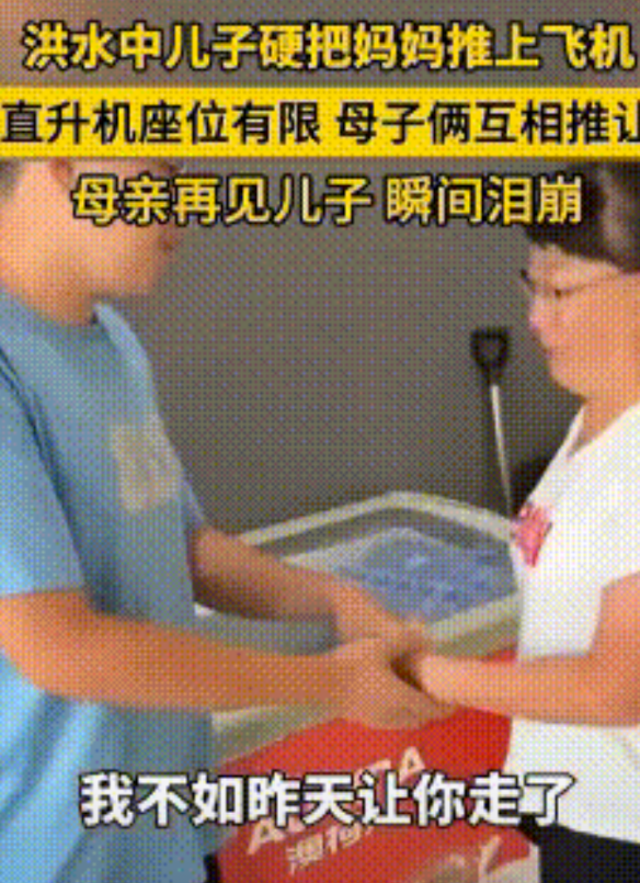 洪水围困,救援直升机上只剩一个座位,妈妈让儿子先上直升机,儿子拿过救援装置直接给妈妈穿上,告诉妈妈:“你先走。” 第二天儿子才脱困,母亲跟着救援人员见到儿子时,顿时泪如雨下,一天一夜悬起的心终于放下来了。