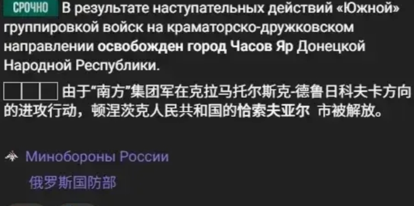 俄罗斯国防部宣布,恰索夫亚尔被解放。 2024年4月5日——2025年7月31日, 恰索夫亚尔战役历时483天,巴赫穆特战役也才224天。 恰索夫亚尔被拿下后,接下来俄军可以使用这个前进基地,来向顿河君士坦丁罗夫卡要塞方向进攻。 下一个绞肉机战场会是哪里?