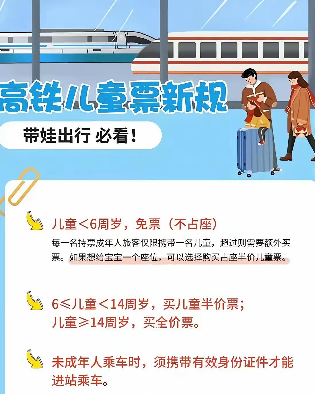2025年的铁路调图工作已经完成了 其中,大量的高铁线路被规划运行 大大的方便了人们的出行和出游… 而人们最关心的高铁儿童票价也有了新的变化和看点… 票价方面和往年大差不差 改变的是未成年人乘坐高铁上时 必须要提供有效的身份证件(身份证、户口们、护照等证件)才能乘坐高铁,不能再附加使用大人的信息了 这将对儿童信息实名制来说 是一件突破性的事情…