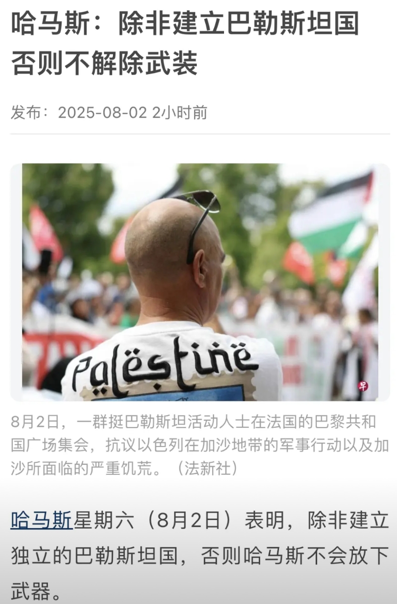 哈马斯有骨气,这是要战斗到底的信号,希望哈马斯不要怂。 建立巴勒斯坦国的话,国际社会也只认巴勒斯坦民族权力机构,也轮不到哈马斯来摘这个桃子。 阿巴斯稳坐约旦河西岸,哈马斯在加沙被按在地上摩擦,前者都没提要求,后者居然想主场大局。 现在球踢到以色列一方,希望以色列也不要怂,看谁能干过谁。