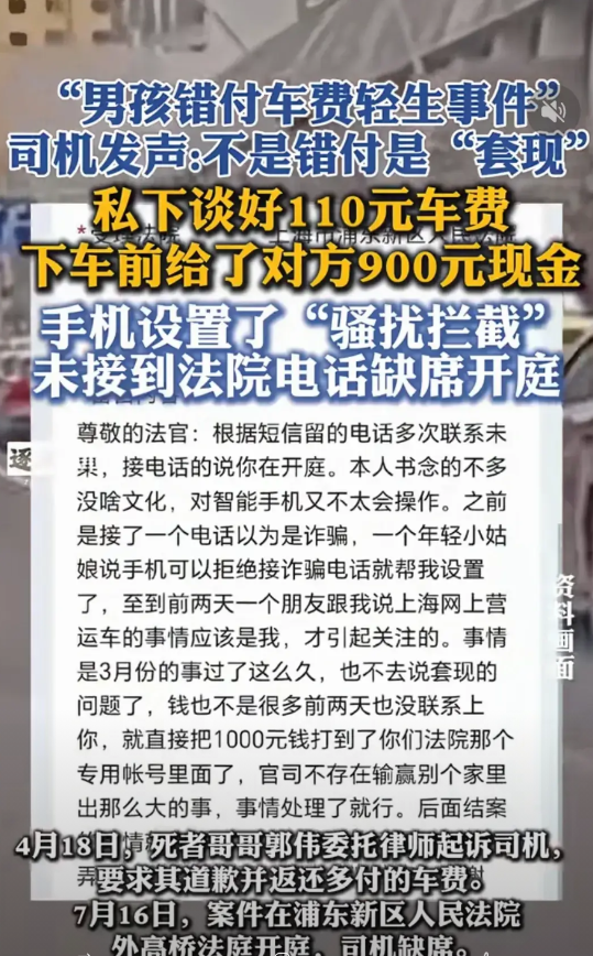 人性之恶,真是叹为观止! 年轻的小伙子已经死了,司机居然跳出来说是小伙子跟他套现900。 意思是自己没有错,小伙子付款1010,车费100,又给了对方900现金。 又说自己屏蔽了陌生人电话,所以没有接到法院电话。 人性之恶,真是叹为观止! 小伙子死了,司机没有半点愧疚不安,反而是觉得人死无对症,想怎么摆脱责任? 说出这么站不住脚的理由,真笑死。 真是把广大网友的智商往地上碾压摩擦啊! 首先,如果是套现了,那事件一发酵时,他完全可以第一时间说明,为什么不说呢? 等人死了,再红口白牙想怎么扯就怎么扯?网友们都这么傻得好忽悠的? 真套现了,拿出证据来,打车都有监控,拿出监控视频,比嘴说要真实。 再者,人家晚上8点还跟你发信息说转错账了,你为什么不回复呢?即便按司机说的,明明已经套现了,没有损失,人家却自杀了? 还有,一般司机真不会带多少现金,因为自己也怕被打劫,即便带了现金,莫名其妙也不会给陌生人套现。 再说,现在微信付款极为方便,小伙子在哪里都可以手机支付,为什么要套现? 我出门都不愿带现金,因为怕丢也麻烦,能手机支付多省事? 还说什么屏蔽了陌生电话所以接不到法院电话,出租车司机做业务需要接电话,一般都不会轻易屏蔽电话吧? 是什么原因让你屏蔽电话? 见识过太多平凡人的善良,为之感动落泪,比如近期的上海一个外卖员送餐路上跳水救人;今天也算见识到人性之恶,为着这900元,且原本就不应该得的钱,逼死了个年轻人,居然还继续在人死后捏造谎言,企图为自己脱罪。 真够凉薄自私的。