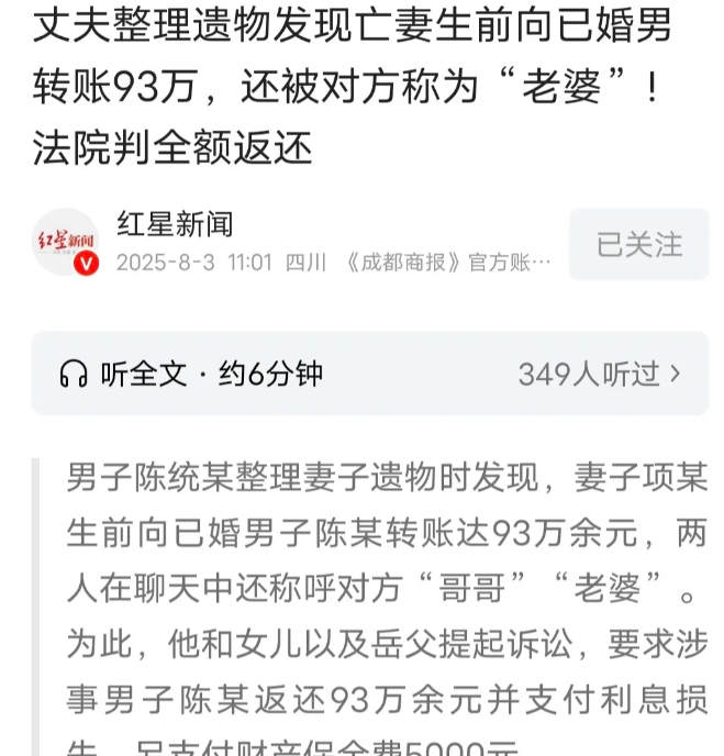 8月3日红星新闻报道一男子被戴绿 帽好几年,老婆死了才知道,她给一已婚男转账93万多,这搁谁都难以接受,男子要拿回属于自己的一切。