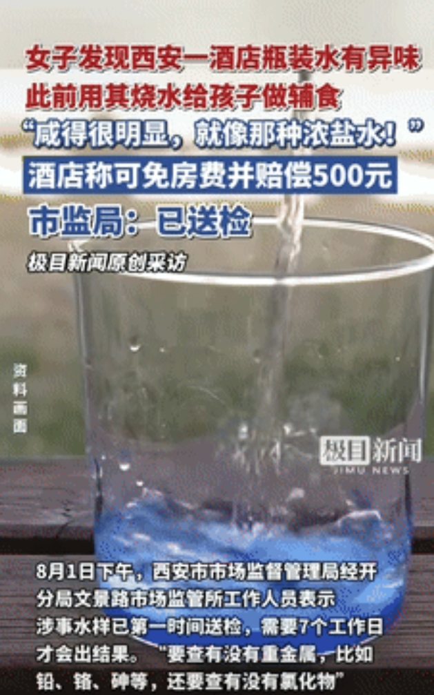 “严查到底!”一女子带孩子到西安旅游,入住酒店后,就用房间提供的瓶装水,烧开水给孩子做辅食,谁料,她让孩子喝水时,孩子非常抗拒,女子没在意,直到晚上用瓶装水给孩子刷牙,顺手喝了一口后,才发现水是咸的,很像浓盐水!