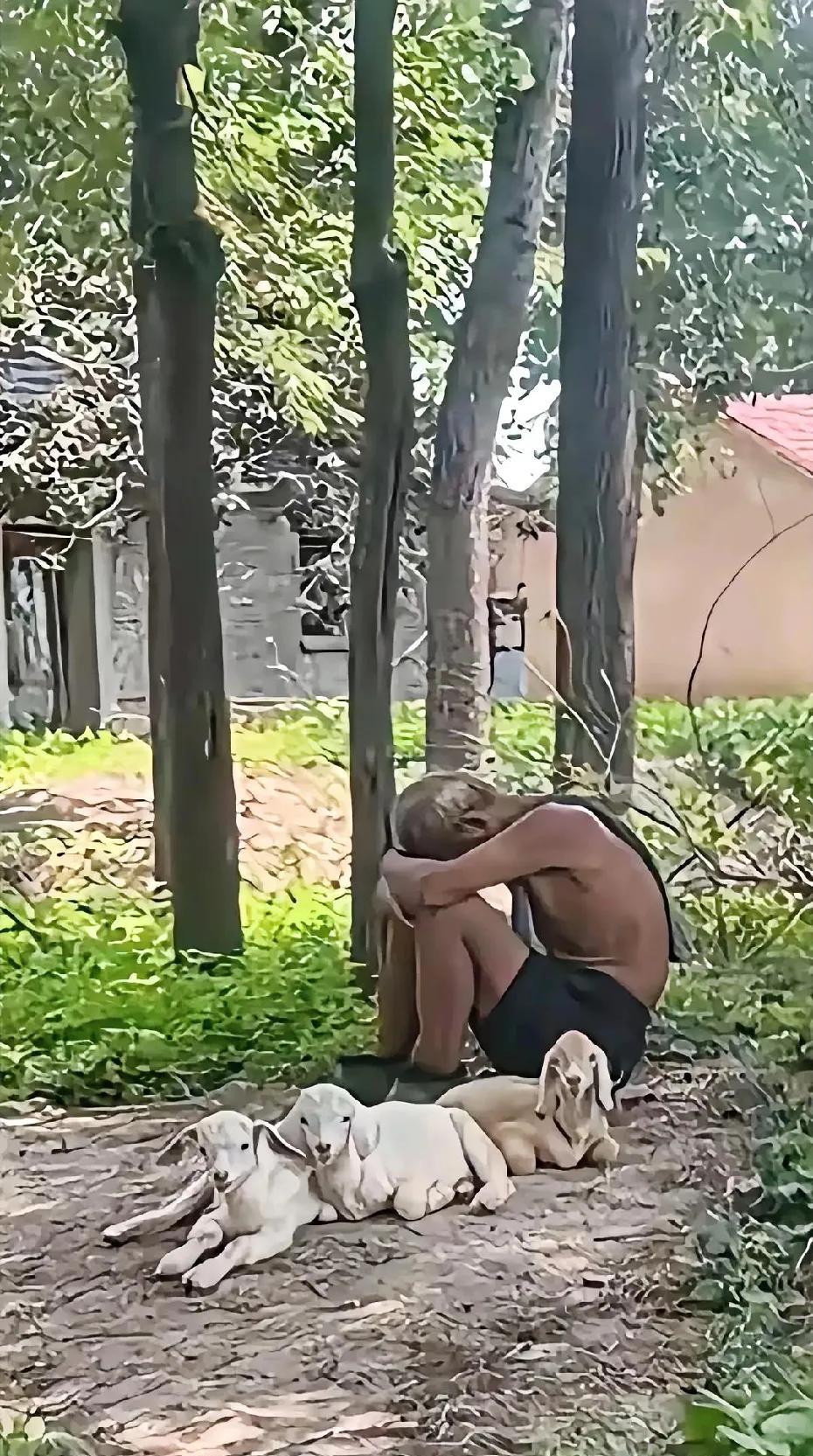 林间小憩 炎光炙野暑熏蒸,树下孤翁对影蹲。 几缕羊儿偎作伴,一襟风色默成痕。 屋垣旧迹藏残梦,岁月轻尘覆老魂。 汗透肌肤心自静,喧嚣远却守晨昏。 #孤寡老人#