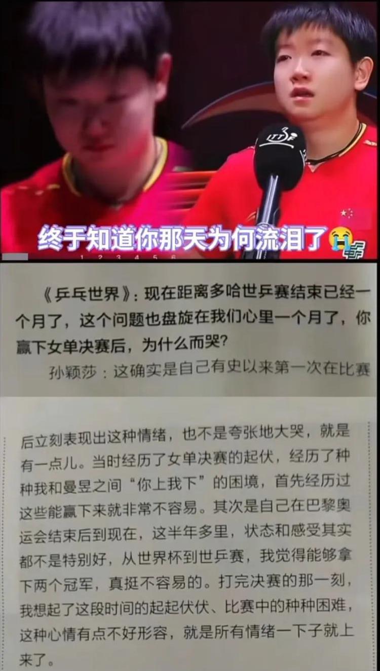 8月份乒乓世界杂志,揭秘孙颖莎多哈世乒赛夺冠后为什么流泪! 多哈世乒赛夺冠是孙颖莎首次在比赛结束情绪外露,巴奥后状态的起伏不定,甚至让她崩溃。 众所周知巴奥后她很难,要面对所有人的冲击,但这些都是技战术方面的问题,可以技改提升自己。 其实最难的是巴奥后她的心态受到了影响,失去了兴奋点,积极点,是充满了失望、沮丧,悲伤无助。之后的每一场比赛她都在咬着牙坚持,努力在自证我还是可以的。 从深圳亚 洲杯的失利,再到澳门世界杯、多哈世乒赛夺冠,有多不容易只有她自己知道。 好在孙颖莎挺过来了,回想这半年经历的点点滴滴,情绪涌上心头,她再也忍不住流泪了。 孙颖莎给了所有人体面,唯独自己吞下了委屈,她展现给世人的永远都是积极阳光的一面,她值得被更多的人爱。