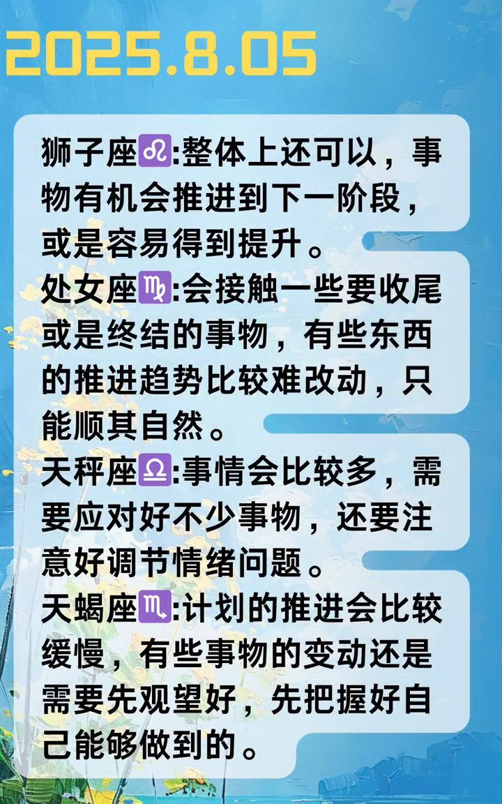 青月每日星座。 ·白羊座:事情会比较多,需要应对好以前累积的一些问题,需要安排好。 ·金牛座:没有得到比较好的关注或认同,事物的沟通和协调还有所不足,注意处理好。 ·双子座:得到的关注没有达到预期,或是帮助没有比较好的效果,还需要自己调整。 ·巨蟹座:事物的推进没有达到预期,或是发展没有那么理想,得到的帮助有限。 ·狮子座:整体上还可以,事物有机会推进到下一阶段,或是容易得到提升。 ·处女座:会接触一些要收尾或是终结的事物,有些东西的推进趋势比较难改动,只能顺其自然。 ·天秤座:事情会比较多,需要应对好不少事物,还要注意好调节情绪问题。 ·天蝎座:计划的推进会比较缓慢,有些事物的变动还是需要先观望好,先把握好自己能够做到的。 ·双鱼座:一些事物容易被其推进会比较缓慢,有些事物的变动还是需要先把握好自己能够做到的。 ·射手座:容易得到团队的帮助,或是在集体活动中有比较好的表现,整体上还可以。 ·摩羯座:能够得到长辈或上级的关照,一些事物也容易得到比较好的指引。 ·水瓶座:得到的关照有限,或是一些准备有所不足,注意安排影响,需要分心去处理,注意调整好自己的安排。
