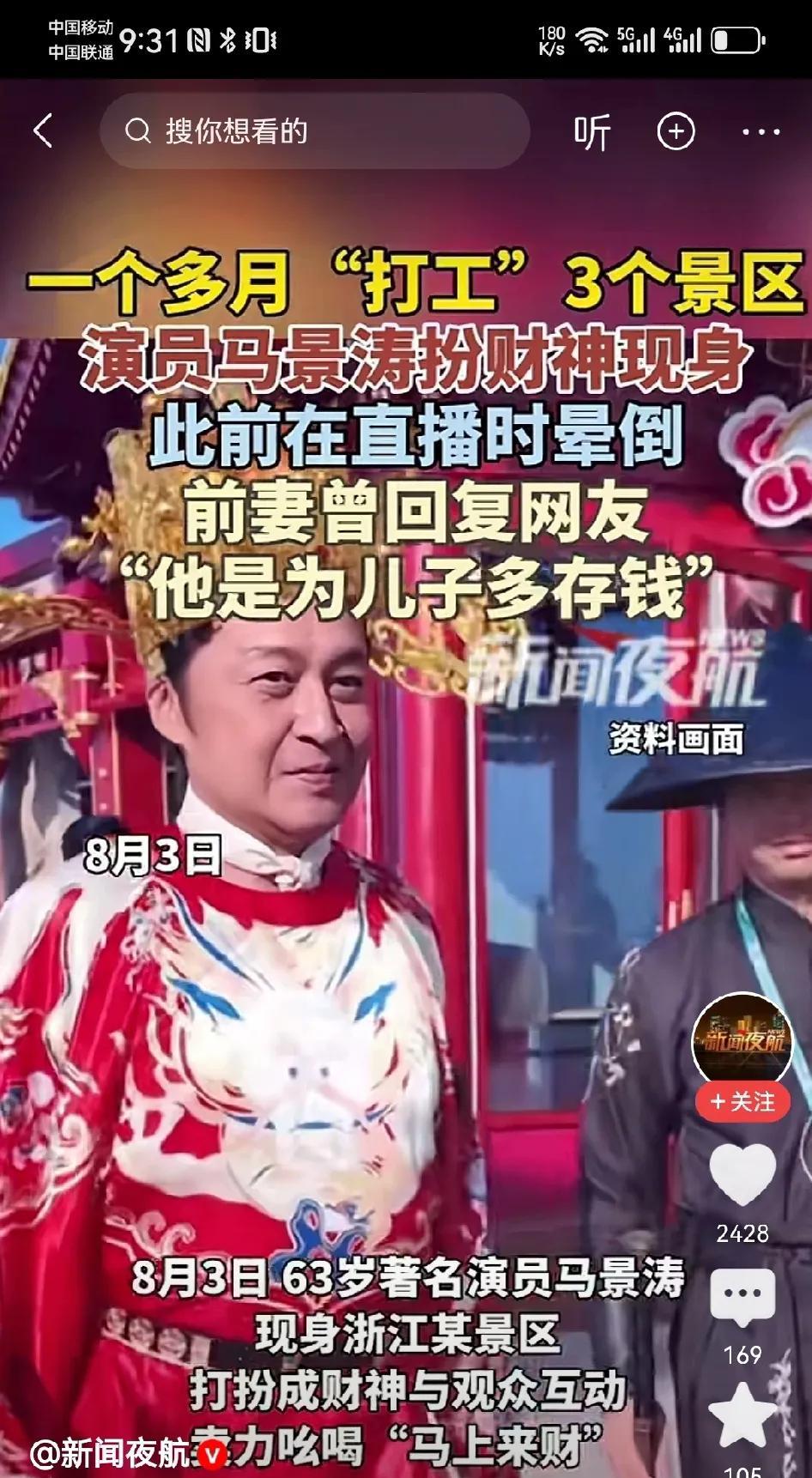 你们不要再骂马景涛了,他只是在尽最大努力想让自己的孩子有更优渥的生活获得更好的教育。最近马景涛辛苦折腾进景区走穴的视频传得人尽皆知,还招来不少骂名。 可是当你了解他为什么这样的时候,你可能就理解他了。马景涛一共有两段婚姻,第一段婚姻生下一个女儿,今年34岁了。 第二段婚姻生下两个儿子,大儿子18岁,小儿子16岁,这两个孩子都还在读书,而且都是送去很贵的国际学校读,两人的学费一年就要40到60万元,加上其它的生活开支,怎么都要本百万去了。 可你想想,马景涛现在六十多岁了,哪有那么多戏可以接,就算接上了,也不是主角,那能有多少报酬呢?所以,为了孩子,他不得不利用自己的名气去接商演赚钱养孩子。 这些可能看起来不像一个老戏骨该有的退休生活,但不是需要钱嘛!光明正大的挣钱,这也能被人吐槽,真是想不通,有什么好吐槽的呢?