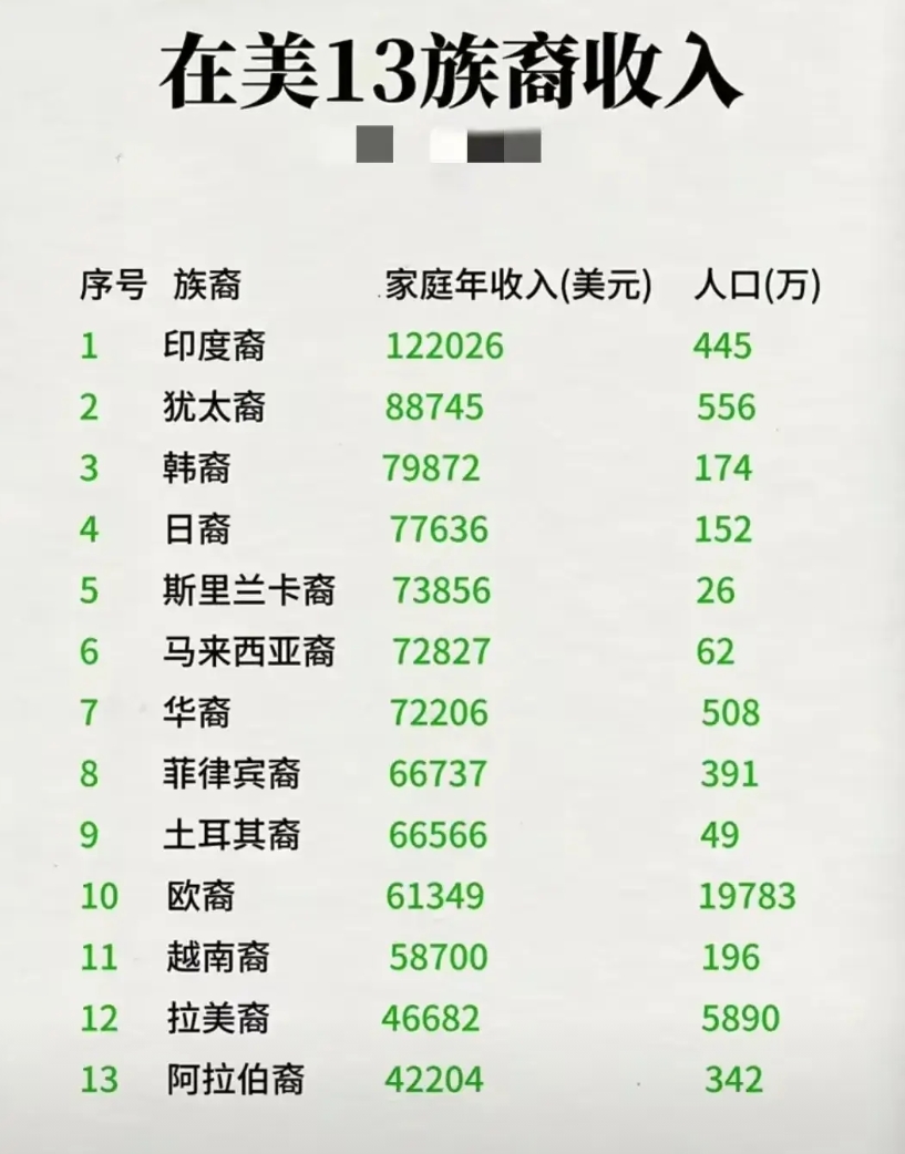 想不到在美国的印度裔,收入是最高的外来群体。甚至犹太裔都不如印度裔收入高,值得佩服。而华裔只能排到第七名,收入不算高。据说华裔两极分化严重。混的好的都是金融,科技,研发等势力,混的不好的就是路边打零工的,类似于凤姐这样的人物。