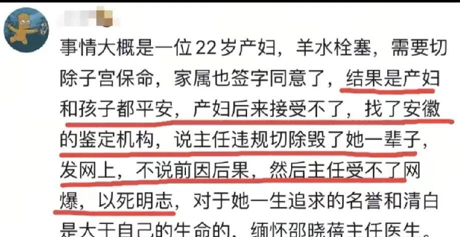 又是一次污蔑,这次害死了一名优秀的医生,同时也让一些产妇的路变窄了。 这起事件要追溯到今年5月18日,身为河南周口第六人民医院妇产科主任的邵晓蓓接诊了一位22岁的产妇,在分娩过程中,产妇遭遇了了羊水栓塞的危险情况,为了包住产妇,不得已切除了她的子宫,家属当时也是签字同意的。 产妇羊水栓塞能救回来,已是奇迹了,这可是被成为产科死神的病症,具有不可预见性,但发病速度极快、死亡率极高,能救回来足以说明邵主任的医术高超。 产妇和孩子能安全,本是天大的喜事,该对医生感恩戴德才对,但产妇偏不,觉得医生没有征求她的意见,剥夺了她再次当母亲的权利。 她们开通了账号,开始给邵医生泼脏水,把自己包装成受害者,不知真相的人开始跟风,邵医生遭受不住网暴,选择了轻生。 那么多人相信她,都说她好,偏偏那么个例外逼死了她,对于有的人来说,清白和名声比生命更重要! 她让产妇们的路更窄了,明明是治病救人的好事,却被围攻,难免有些医生心里就会打鼓,会不会落到同样境地,就那么一会儿的迟疑,就有可能是一条生命? 必须严惩网暴者,造谣生事,唯恐天下不乱。 #产妇医院身亡# #医疗悲剧# #女医生悲剧# #周口医生邵晓蓓跳楼身亡# #头号创作者激励计划#