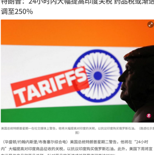 因为购买俄罗斯石油问题,川普再次对印度发出严厉警告,称“24小时内大幅提高对印度商品征收的关税”。而让印度方面“惊怒交加”的是,对于同样购买俄油的东大,川普在这一最后通牒中却只字未提。据联合早报等外媒报道,这是川普两天之内第二次就购买俄油问题向印度极限施压,显示形势已极为紧急。