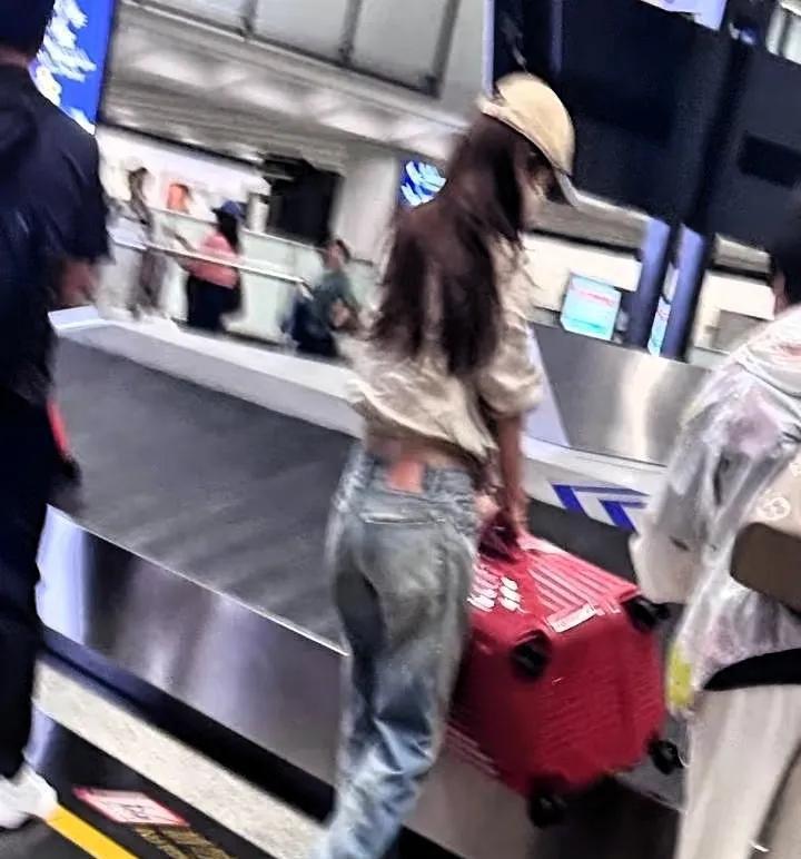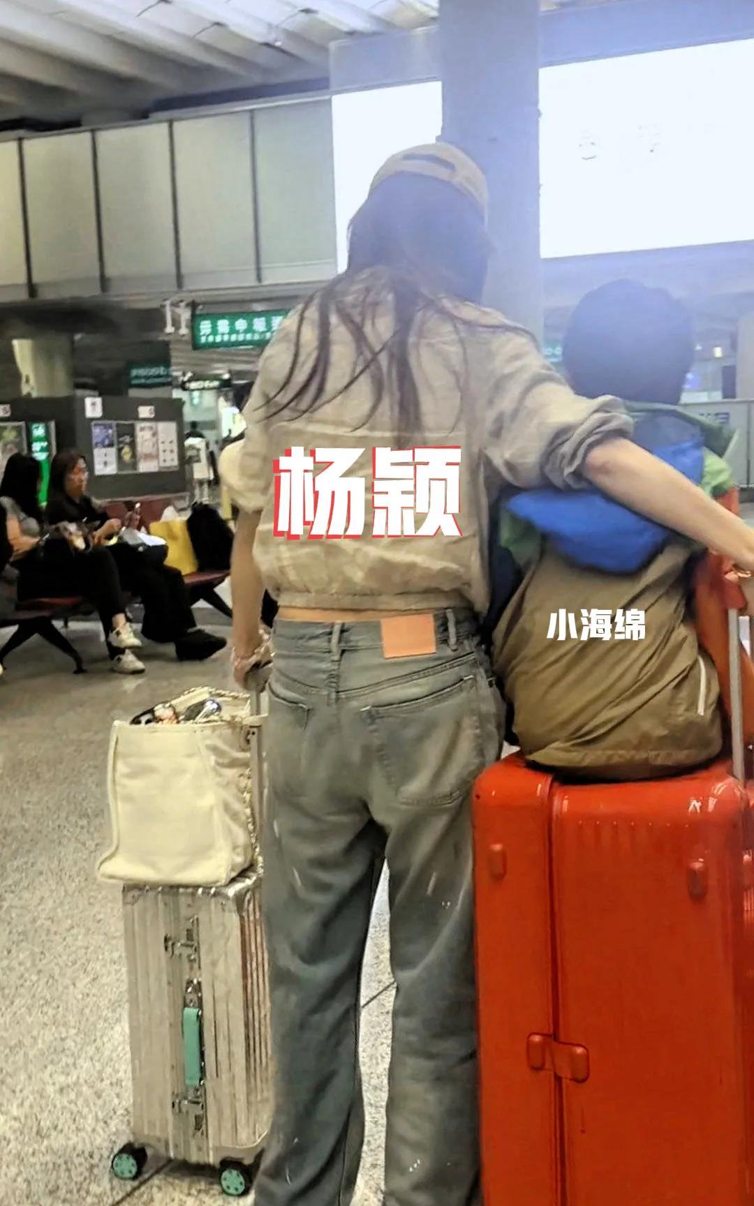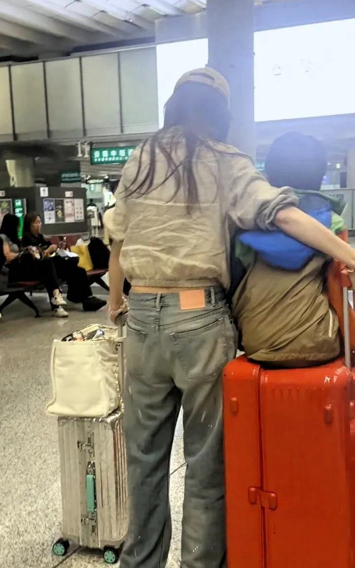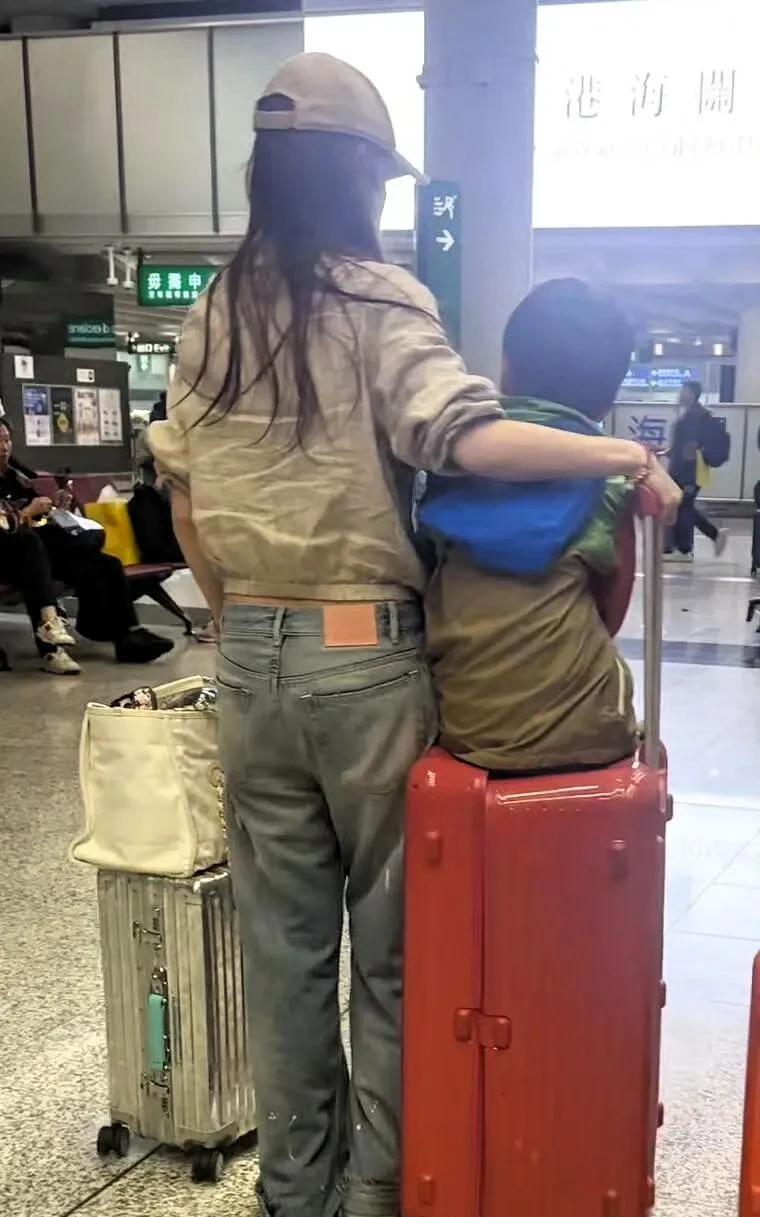网友机场偶遇Angelababy带儿子小海绵从上海返回香港,瘦弱的她一手拖着两大