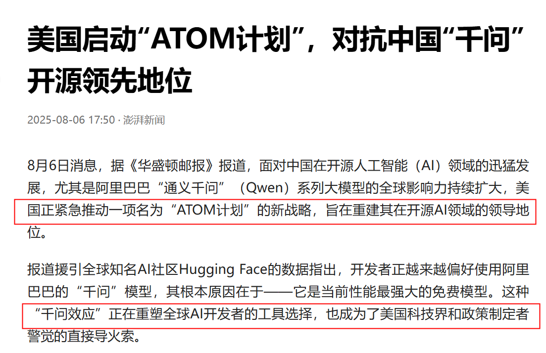 《华盛顿邮报》近期报道称,随着中国在开源AI领域的迅猛发展,为了从阿里通义千问这些中国AI手中夺回开源AI主导权,美国正在紧急推动一项名为“ATOM计划”的新战略,以此来重建其开源AI领域的领导地位。
