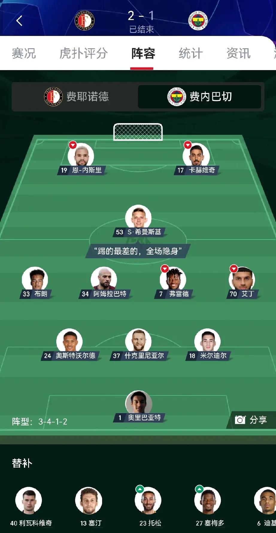穆鸟又输了!欧冠资格赛第3轮首回首回合穆鸟的费内巴切被费耶诺德绝杀。不知道第二回合还能逆转取胜吗? 我记得费内巴切上赛季好多比赛都是靠哲科救主的,这赛季不知道谁回站出来救主了,总不能把希望放在杜兰身上吧? 穆鸟也是够惨的,去土耳其了还是不能拿联赛冠军,这加拉塔萨雷新赛季的锋线也太恐怖了,奥斯梅恩、萨内、莫拉塔、伊卡尔迪够穆帅喝一壶的。 感觉这赛季的费内巴切阵容实力也没有补强啊,还走了几个主力,来的人也不咋的。你让穆帅怎么玩?
