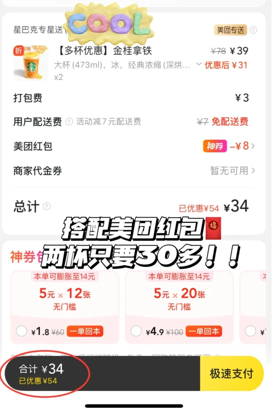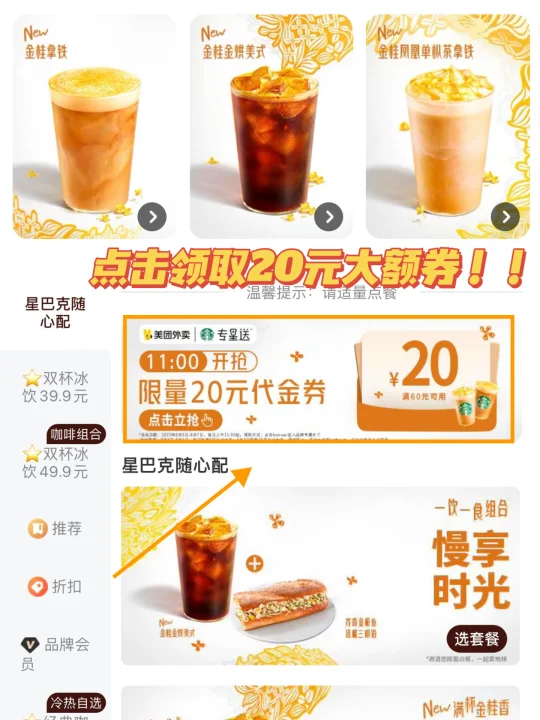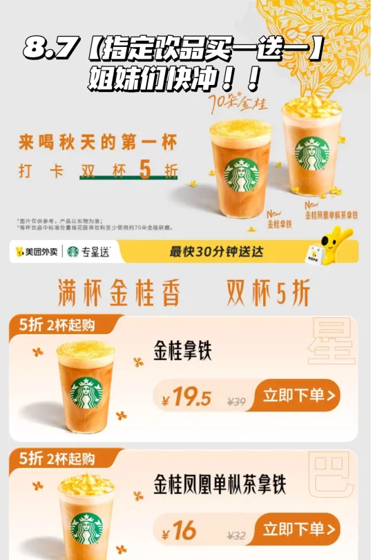 不愧是我!带着办公室的小伙伴11r喝到了星巴克!!!被大家好一顿夸!👍 不得不说星爸爸这一波福利玩的真大!暖的本打工人心里甜滋滋的!😍 🌟点单攻略手把手教给大家(如图),星巴克可别再原价喝了! 秋天的第一杯奶茶强烈安利金桂拿铁和金桂凤凰单枞茶拿铁☕️ 喝起来就是天然的桂花香,一口就感受到秋天!入秋的仪式感拉满了! ⏰8.7号还有指定饮品买一送一,也可以叠加美团官方红包,9r/杯不是梦!!!