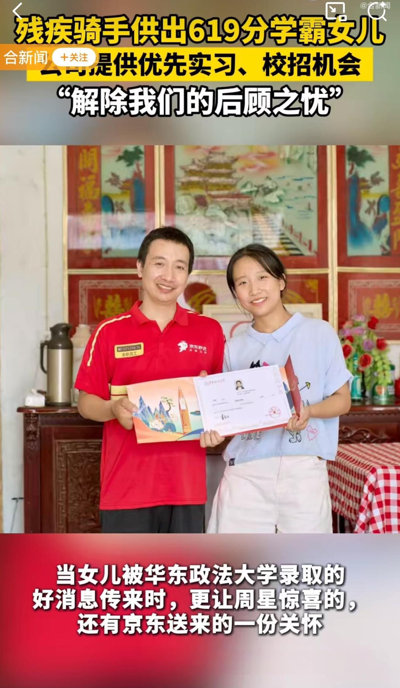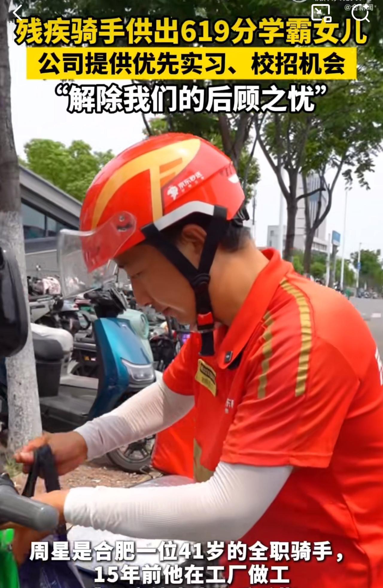 #MCN双量进阶计划#“真是厉害!”安徽合肥,一位41岁的骑手周星,15年前因工伤失去右手手指,却未被不幸打倒,凭借努力月入过万。近日,他的大女儿周妍以619分考入华东政法大学,让他倍感自豪。周星称“再难也要供她读书,让她看更大的世界”。 此视频曝光之后,不少网友纷纷表示,“独臂骑手托起女儿法学梦,高考619分背后是15年的无声父爱!” 这事儿看着真让人心里热乎乎的。一个没了右手手指的父亲,靠骑外卖车硬生生撑起一个家,更用“再难也要供她读书”的信念,把女儿供成了619分的学霸,考上了好大学。 这背后,是无数个风雨无阻的送餐瞬间,是单手握紧车把时的坚持,更是父亲用行动给女儿上的最生动的一课。生活或许有残缺,但努力能补全遗憾。 这父亲身上那股劲儿,比啥都值钱。生活给了他一闷棍,他没趴下,反倒更拼了,月入过万的背后,不知道多跑了多少单、多熬了多少夜。女儿也争气,没辜负这份辛苦,考出这么好的成绩,这就是对父亲最好的报答吧。 网友说这是“无声的父爱”,真没说错。有些爱不用挂在嘴边,就藏在一天天的奔波里,藏在“再难也要供你读书”的倔劲儿里。 其实生活里好多普通人都这样,遇着坎儿不躲,一门心思为孩子奔,这就是最实在的幸福。而女儿选择政法专业,或许也是在父亲的坚韧里,读懂了对公平与尊严的追求。 对于这位残疾父亲供出619分学霸女儿,大家怎么看呢?#长沙新朋友# #寻美三湘#