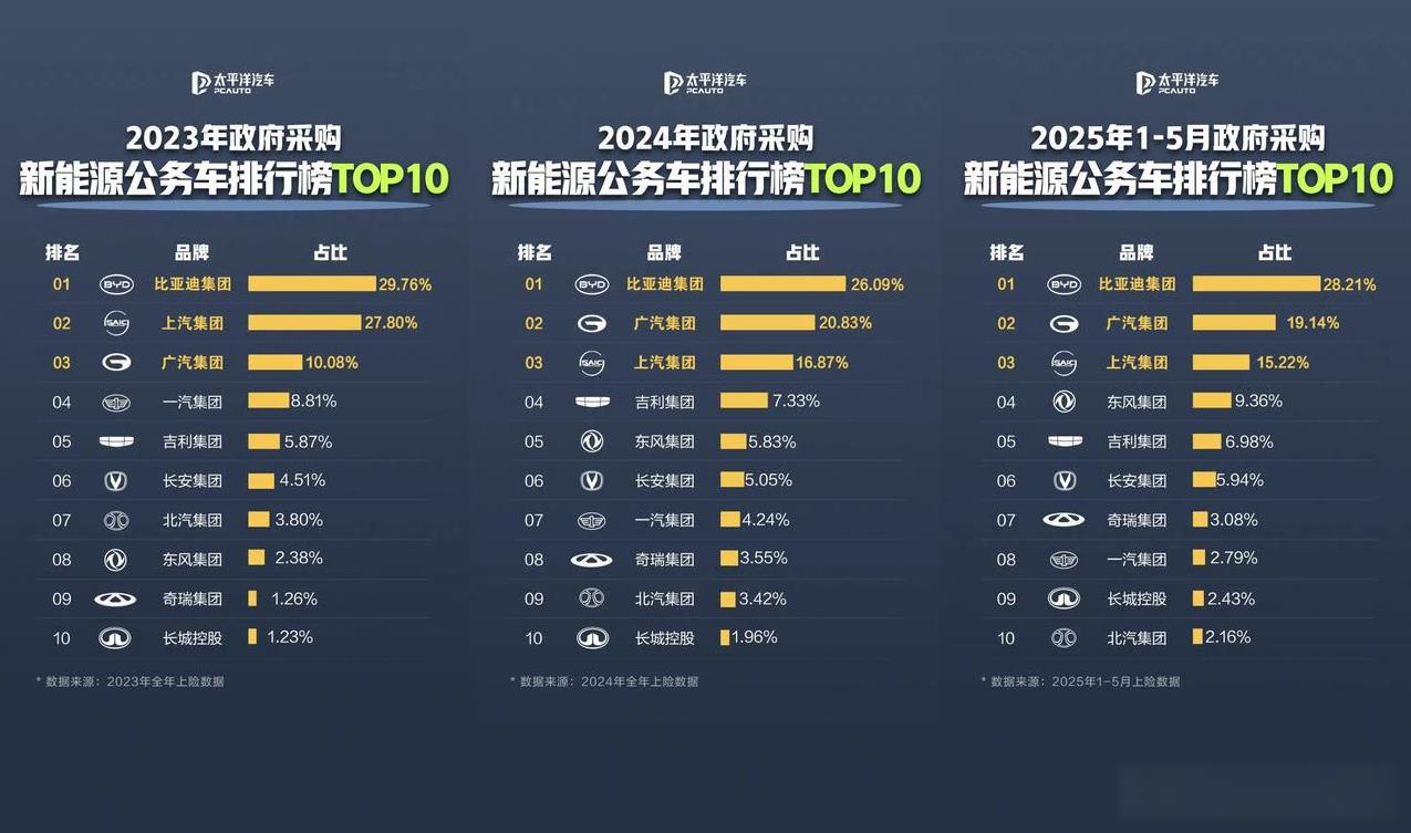 在8090后的印象里,公务单位的停车场清一色是凯美瑞、帕萨特、雅阁、迈腾等外资合资品牌,而公务员的偏好往往被视为消费市场的风向标,间接助长了这些车型的热销。近年来,公务员的用车选择早已发生了变化,国产品牌成为公务员用车的热门选择,比如比亚迪、广汽、上汽等等。 随着中国汽车工业的快速崛起,国产新能源凭高超的配置、领先的三电和极好的驾乘感,逐步成为公务员群体的主流选择。以比亚迪为例,汉、唐、宋、海豹、海豚等车型不仅成为公务员的购车首选,还进入了政府采购清单,可以说是体面与务实的不二选择。 今年5月份,相关政策要求公务用车集中采购,应当选用国产汽车,优选新能源。最后来看一组太平洋汽车的调研报告,比亚迪、上汽、广汽连续三年稳居前三,年年第一的比亚迪成体制人严选车型,平均每三台公务车就有一台是比亚迪。 政府大院停满国产新能源既是产品力胜利的缩影,也是中国品牌崛起的宣言,国产加油!