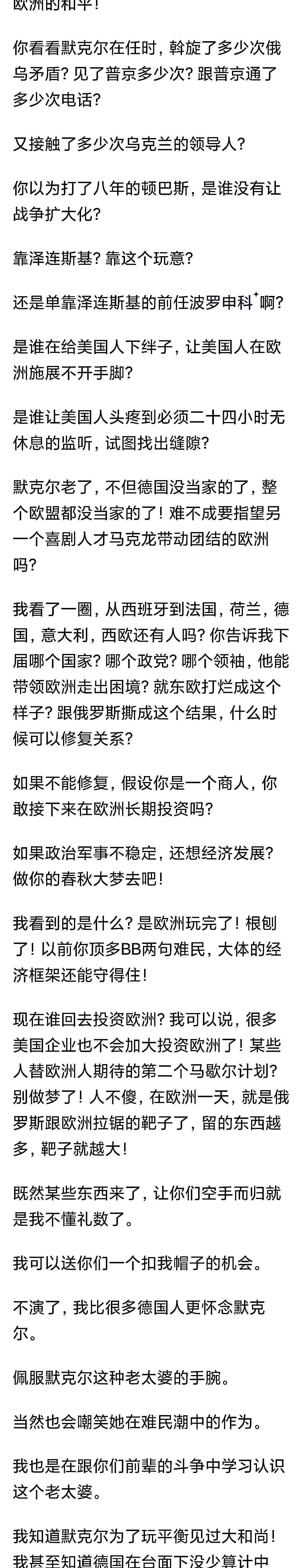 德国人是否开始怀念默克尔? 给我看的一愣一愣的~ 非常同意欧亚大陆联通这个终极目标,可能会成为本星球上的最大战略目标,就像“地理的历史枢纽”强调的一样,心脏地带确实是大陆的核心,是可以联通欧亚板块的中枢作用。 我们虽然不具备地缘优势,也不具备资源天赋,唯一可靠的就是自强不息的人民,战天斗地的群众。在大陆板块联通的这个过程里,起决定性作用的确实不一定是中国,但建设过程中发挥最大作用的一定是中国。这个过程的推进,才真正是民族复兴的关键,让中国人重新站回世界顶点。 其他的国家会坐视不理吗?肯定不会,所以才有马斯克星链计划,所以才有日本军费暴涨,所以才有现在我们能看到周围的一切。 作为普通人,我相信即使我们不去刻意做些什么,只要跟住这一波趋势,也能拥有巨大的红利,就像二战后的美国人一样。