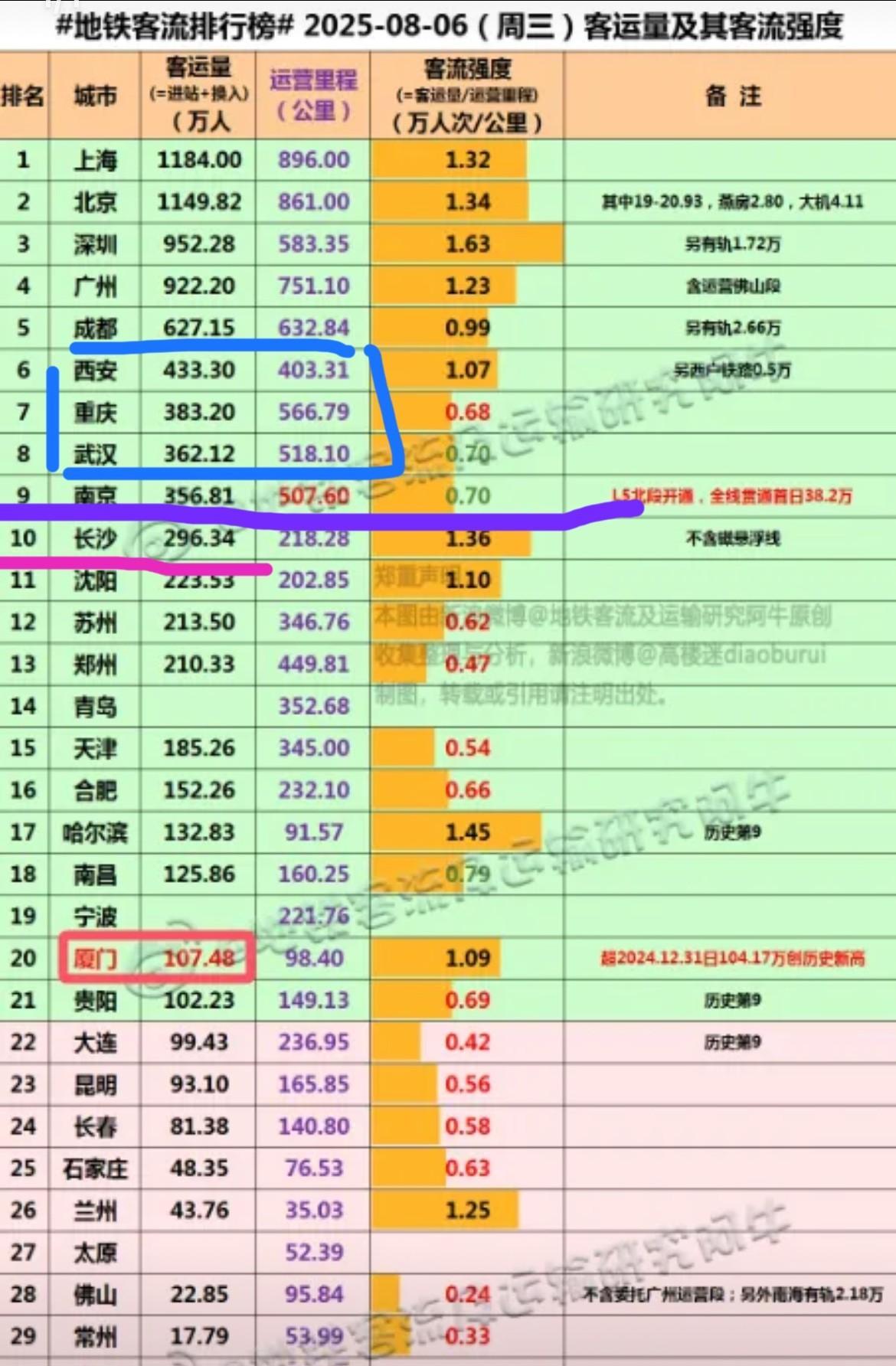 南京地铁以前客流量不如长沙和西安这类城市高的主要原因在于主城区地铁路网密度太低。笔者在前面文章中早有类似断言 自从南京地铁5号线开通运营后,南京地铁客流量蹭蹭蹭上来了,目前已远超长沙客流量,足以证明笔者之前的判断。 目前南京地铁工作日客流量已经稳定在300多万人次,待2025年底6号线和10号线二期这两个主城东部区域主干线开通运营后,届时南京地铁客流量可以达到日均400万人次左右,将达到或者超过目前武汉,重庆,西安等城市客流量等级。 信不信?请拭目以待!