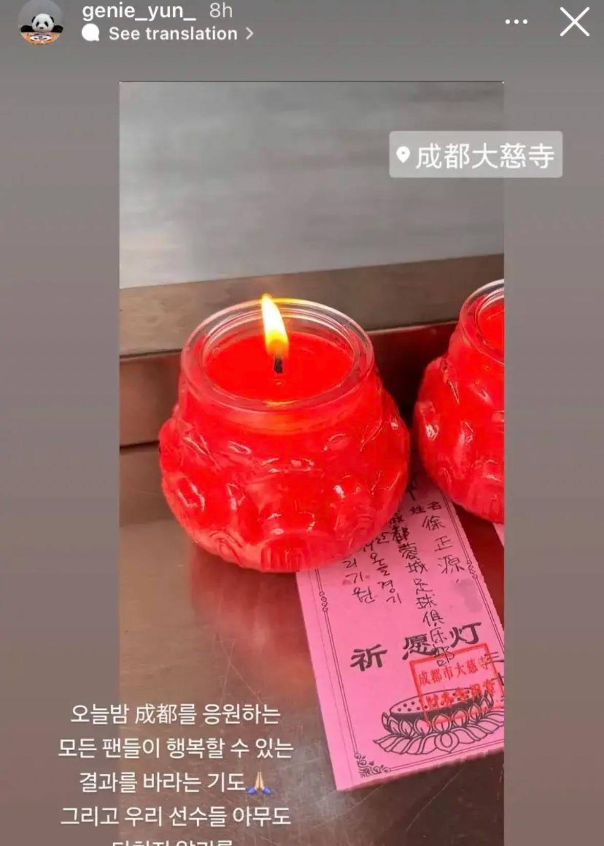 成都蓉城主教练徐正源的夫人真是有情有义啊。在和大连英博比赛赛前,她为球队祈福。比