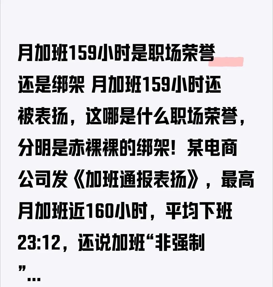 月加班159小时是职场荣誉还是绑架 月加班159小时,这到底算是职场荣誉呢,还是一种绑架呢?月加班159小时居然还受到表扬,这哪里是什么职场荣耀啊,根本就是明晃晃的绑架嘛!有一家电商公司发布了《加班通报表扬》,员工最高一个月加班将近160个小时,平均下班时间是23:12呢,还宣称加班是“非强制”的,可要是不申请加班就没有加班费,这不是在强迫员工加班吗? 《劳动法》明确规定,每个月加班时长不得超过36小时,而这家公司超标了4.4倍,这简直就是明目张胆地违法啊。公司妄图用一张表彰榜来哄骗员工,还拿所谓的榜样当作幌子,让大家互相“内卷”,这就是彻头彻尾的PUA手段啊。员工辛苦努力地工作,结果却被当成傻瓜一样对待,这种所谓的“荣誉”,不要才是明智的。职场不应该是这样压榨员工的地方,大家一定要对这种“荣誉绑架”提高警惕啊! #加班劳动法# #对加班的看法# #硬性加班# #企业强制加班# #加班好处# #加班新定义#