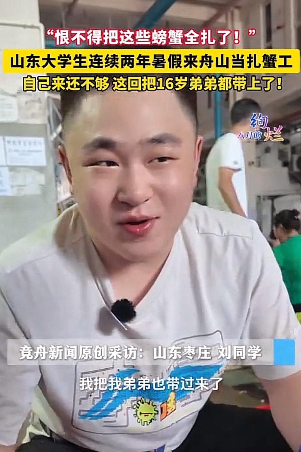 #山东大学生连续两年暑假当扎蟹工#真优秀!山东大学生连续两年暑假赴舟山当扎蟹工,今年还带上16岁弟弟组团“搞钱”! 这位大学生坦言,去年辛苦几天只赚了300元,今年目标明确:“要赚3000元!”,他带着弟弟计划干满20天,干劲十足地说“有多少干多少,恨不得把那些蟹全部都扎了”。 看完这事儿,周少不得不称赞这俩兄弟真挺能干的!放暑假不闲着,还带着弟弟出来打工,比起那些在家躺平玩手机的,这股子劲头就挺让人佩服。 去年干了几天才赚300块,今年目标直接涨到3000元,还计划干满20天,光听着就觉得不容易。 扎蟹这活儿一点不轻松,手都得磨出茧子就算了,还可能手扎伤,可他们还说“恨不得把蟹全扎了”,这份踏实肯干的劲头,让平凡的兼职时光透着青春奋斗的朝气。 现在不少年轻人总觉得干活累、赚钱难,可这兄弟俩用实际行动说明,踏踏实实干,总能有收获。更重要的是,这种暑假工不光能赚点钱,还能让孩子知道挣钱不容易,体会父母的辛苦,对他们来说肯定比钱更金贵。 对于这位山东大学生带着弟弟去舟山当扎蟹工,大家怎么看呢?#长沙新朋友# #寻美三湘#