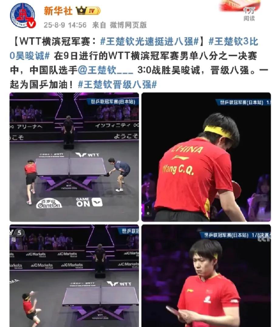 王楚钦光速进8强, 央妈光速发文祝贺鼓励! 央妈太给力了,祝贺又来了, 这边比赛刚刚结束, 央妈就发文了, 火箭般速度, 央妈也是偏爱, 这样的娃谁不稀罕, 谁不爱, 谁不为之骄傲呢! 王楚钦继续加油!