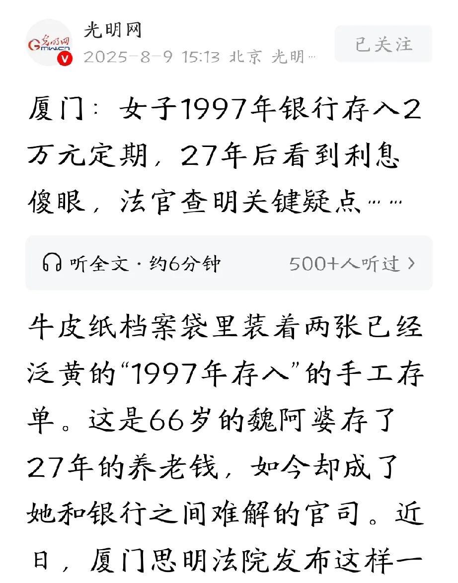 福建厦门,27年前,女子将2万元存了一年定期,工作人员明确告知,到期不用到银行来,他们会自动转存。女子很放心,便将存单收了起来。27年后,女子拿着存单满心欢喜到银行取钱,本以为光利息就有3万多,谁知工作人员一口咬定,只有4000块钱。女子震惊了,觉得是银行故意欺负她不认字,要求补齐利息差额2.8万,银行不肯,女子闹上法庭。谁知法官的一个发现,让银行瞬间打脸。 据光明网8月9日报道,1997年夏天,魏阿婆攥着攒了大半辈子的2万块,走进了银行。 这2万块对一个农村家庭来说,可是一笔巨款,她要存起来,当做后半辈子的保障。 她告诉工作人员存个定期,工作人员办理好后递出存单,并表示,到期会自动续存。 魏阿婆一听,心里顿时踏实了,便放心地把存单收进了木匣子,这一放就是二十七年。 这二十七年里,魏阿婆偶尔也会想起这笔钱,但一想到银行当初的承诺,就觉得没必要操心。 到了2024年底,78岁的魏阿婆身体大不如前,整理旧物时,她偶然翻出那张泛黄的存单。 魏阿婆很激动,按当时的承诺,这2万元应该翻倍了,放到现在虽然不算太多,但是意外之喜。 于是,她拿着存单来到银行要去取钱,但柜员经过测算,告诉她利息竟然只有4000多块。 魏阿婆当时就懵了,这怎么可能呢,按照当年工作人员所说,每年自动转存,利息应该有3万多,这差距也太大了。 魏阿婆怀疑,工作人员是故意欺负她这个农村老太婆不识字。 工作人员解释称,因为存单上没写“自动转存”,所以银行只能按活期计息。 魏阿婆听着这话,情绪非常激动,自己大字不识几个,当初就是听了银行工作人员的话才存的钱,哪知道还有这么多规矩。 而且,其他银行都是为客户办理自动转存,就算不能转存,银行和应该及时提醒告知顾客,不能放任27年不管,这严重侵害了她的权益。 所以,魏阿婆要求银行,必须补偿给她自动转存应得的利息差2.8万元。 可银行坚持认为,由于存单显示存款定期一年,并未标注“自动转存”等信息,所以银行无权为客户自动转存,也没有告知义务。 双方协商不下,魏阿婆一纸诉状将银行告上法庭。 法官经过调查,发现银行测算的4000元利息很奇怪,既不是银行所说的按活期计息那么少,但又少于27年转存的总额。 银行负责人翻出系统记录查看,很快有了惊人的发现。 原来,2003年银行系统升级时,工作人员把魏阿婆的手工存单转成电子存单时,漏掉了自动转存设置。 从1997到2003年,银行确实按定期转存计息,可2003年后系统没续上,利息就没了。 发现问题出在他们自己身上后,银行的态度发生了大转变。 最终,银行给出了人文关怀方案,按一年期自动转存计算,补足27年应得的利息差。 经过协商,魏阿婆接受了该方案,此事终于圆满解决。 对此,不少人表示,银行太不地道了,27年前的2万,比现在20万还值钱,要是那时候欠银行2万,利滚利到现在,要欠银行多少钱? 而且,明明是银行的失误,却说成人文关怀,吃相未免太难看了。从法律角度,应该如何看待银行的行为? (一)银行是否负有自动转存的义务? 根据《储蓄管理条例》第18条:定期储蓄存款到期后,储户未支取的,按存单开户日储蓄存款利率计付利息,除非储户与银行明确约定自动转存。 本案中,存单未载明“自动转存”条款,银行主张“无自动转存义务”符合条例规定。 但是,银行工作人员口头承诺“到期自动续存”,根据《民法典》第509条:当事人应按约定全面履行义务。 银行工作人员的口头承诺构成合同内容的一部分,尤其对文化程度较低的储户,银行需承担更高注意义务。 (二)银行系统升级失误的责任认定 银行在2003年系统升级时漏设自动转存,导致2003年后利息损失。 银行系统升级属于内部操作流程,因工作人员疏忽导致储户损失,银行需承担过错责任,补偿差额利息。