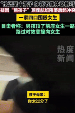 “严惩到底!”深圳飞往大连的航班上,一男孩持续用脚踢前排座椅,前排女子多次警告无果后骂了男孩,谁料,男孩很不爽,路过时故意撞掉女子耳机,飞机降落后,双方发生发生争执,女子被一家四口围攻,一度打趴在地,女子要报警,男孩妈妈表示:他还是个孩子,你太过分了!   据热度新闻8月9日报道,男孩在飞机上找到自己的座位后,因为不能玩手机,始终静不下来,烦躁的他频繁用脚踢向女子的靠背,原本在休息的女子,顿时被吓到了。   她扭头提醒男孩,可男孩非但没有收敛,还愈发过分,他家长亲眼目睹了这一切,却没任何阻止的意向,任由男孩发泄自己的情绪,如果一次两次踢她的座椅,还能说是不小心。   但次数多了,很难不让人怀疑男孩是故意的,女子再也没法忍受,她又不是男孩的什么人,凭什么要让着他,于是提高音量大声警告男孩。   既然好声好气换不来男孩的体谅,就怪不得她了,男子听到这话,直接起身狠狠撞向女子,女子想和男孩理论,结果遭到了男孩父母的殴打。   双手难敌四拳,女子有心想还手,但还是倒在地上,女子自认为自己没做错什么,乘务员急忙把男孩一家拉开,等众人回到地面后,女子果断拨打报警电话。   这时男孩母亲害怕了,她认为女子这么大的人了,该体谅她的孩子,可她孩子变成这样,跟父母有脱不开的责任,除了家长会溺爱外,外人可没这个义务惯着男孩,目前民警已经介入。   对于这件事情,大家有什么看法?