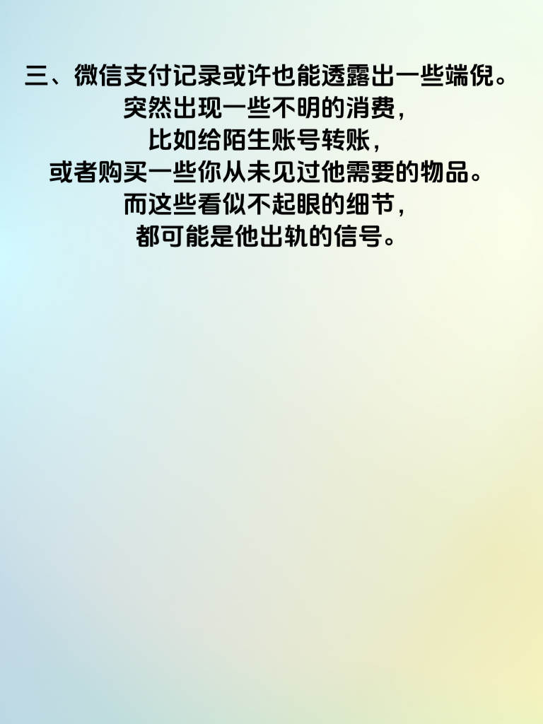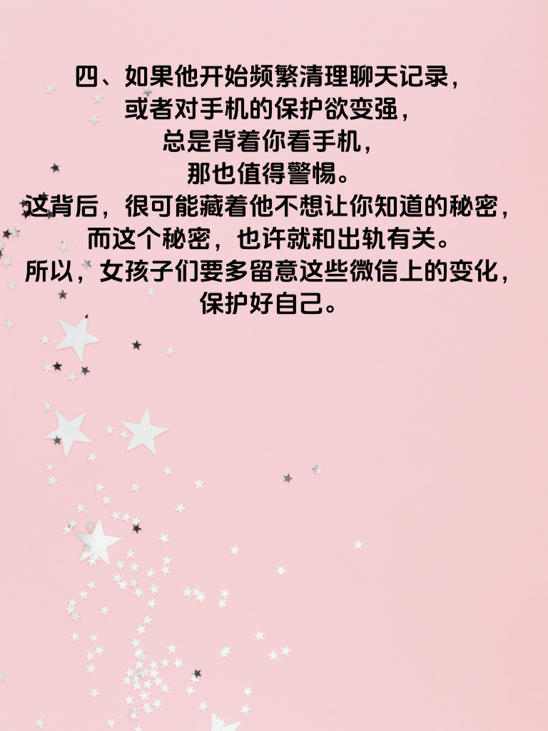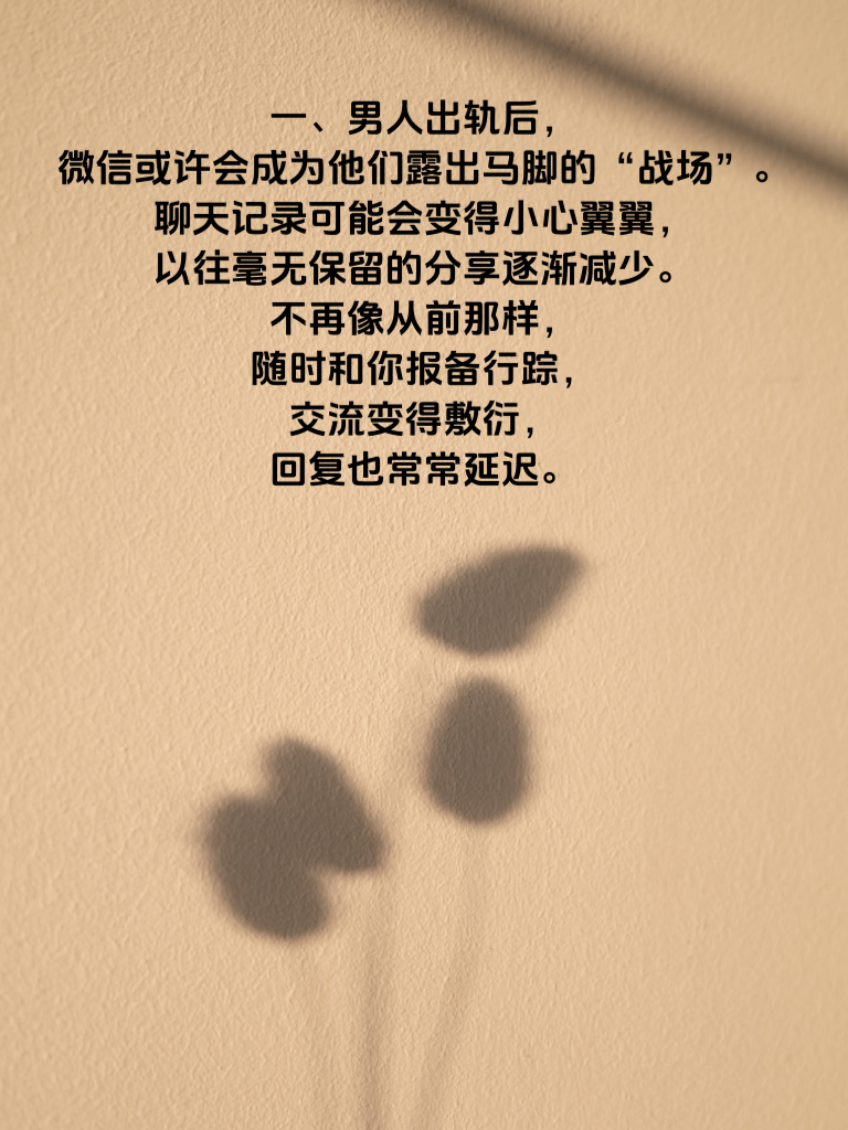 一、男人出轨后,微信或许会成为他们露出马脚的“战场”。聊天记录可能会变得小心翼翼,以往毫无保留的分享逐渐减少。不再像从前那样,随时和你报备行踪,交流变得敷衍,回复也常常延迟。 二、朋友圈也可能出现微妙变化。不再频繁晒你们的甜蜜日常,甚至开始设置分组可见,那些出轨的蛛丝马迹或许就藏在对某些特定人的屏蔽里。原本积极互动的朋友圈,点赞评论他人的动态增多,对你的关注却悄然降低。 三、微信支付记录或许也能透露出一些端倪。突然出现一些不明的消费,比如给陌生账号转账,或者购买一些你从未见过他需要的物品。而这些看似不起眼的细节,都可能是他出轨的信号。 四、如果他开始频繁清理聊天记录,或者对手机的保护欲变强,总是背着你看手机,那也值得警惕。这背后,很可能藏着他不想让你知道的秘密,而这个秘密,也许就和出轨有关。所以,女孩子们要多留意这些微信上的变化,保护好自己。