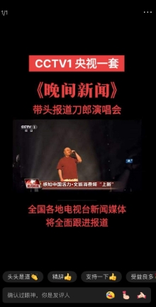 老头乐嘴里能有一两句实话吗?一直造谣刀郎一次都没上过央视,说央视这样高大上的平台力挺云朵,不会让刀郎上央视。 天天吹捧云朵上央视,央视力挺云朵。上过央视的人多了去了,一些有点名气的女网红不照样上央视吗?唱罗刹海市走红的抖音女主播吴彩乐去年也在央视唱了歌。 基本每天在头条都能看到老头乐诋毁造谣刀郎一次央视也上不了,难道大众喜欢谁以他上没上央视为标准?如你们所吹,既然谢春芳女士经常在央视唱歌,那她应该超级火啊?一千多万的粉丝昆山演唱会几千张门票卖了一个月,没卖完