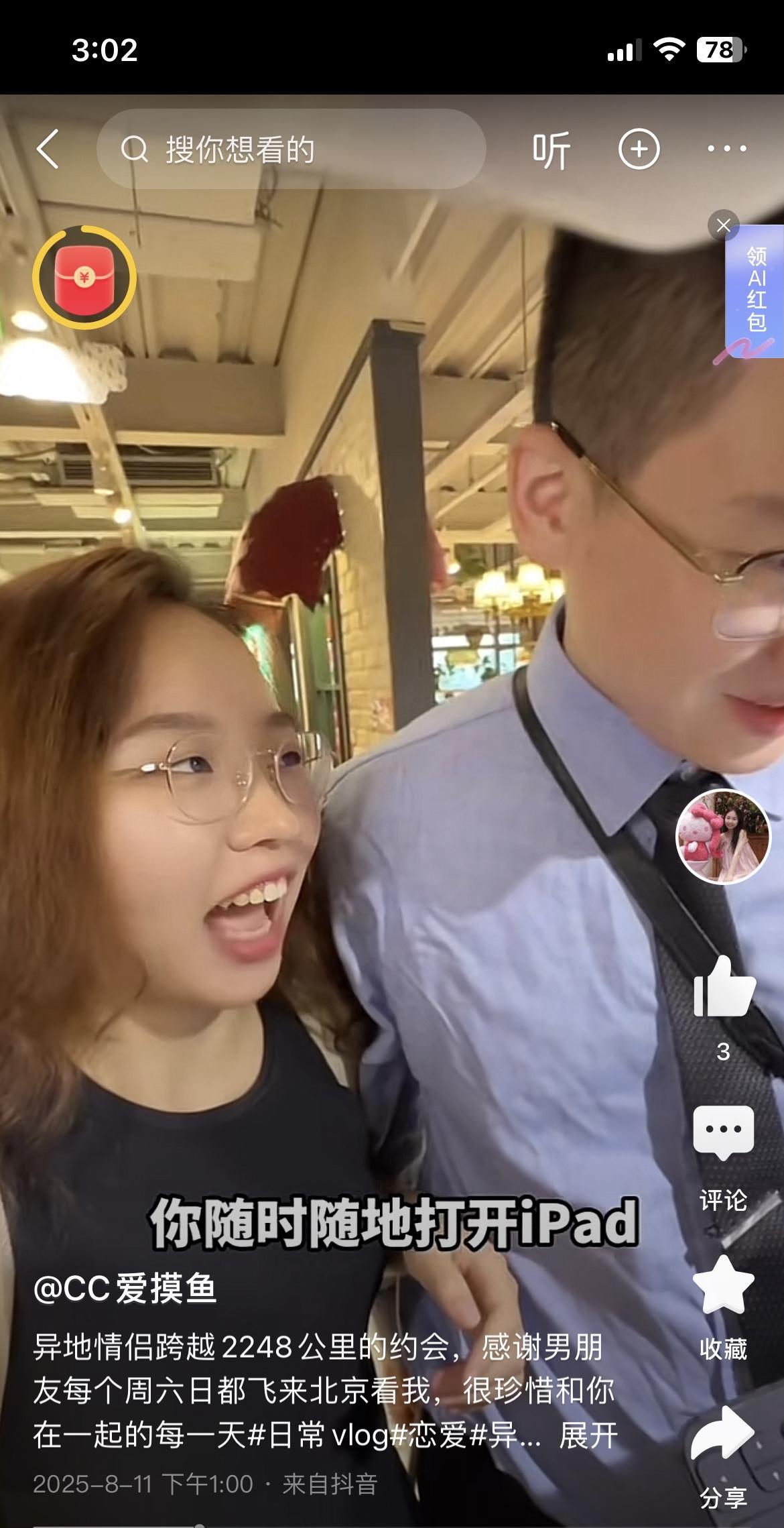 今天看到了cc跟男朋友约会的一天。 恋爱中的cc一改往日在三剑客中呈现在粉丝面前的大大咧咧,咋咋呼呼的形象。恋爱中的cc漂亮又可爱,温柔大气又体贴。cc的男朋友英俊帅气,对cc也是体贴有加,一看就是职场精英。 cc已经成为了一名独立的自媒体博主,又找到了一位这么多金又帅气的男朋友。 cc真是一个有福气的女孩子,好幸福哦。