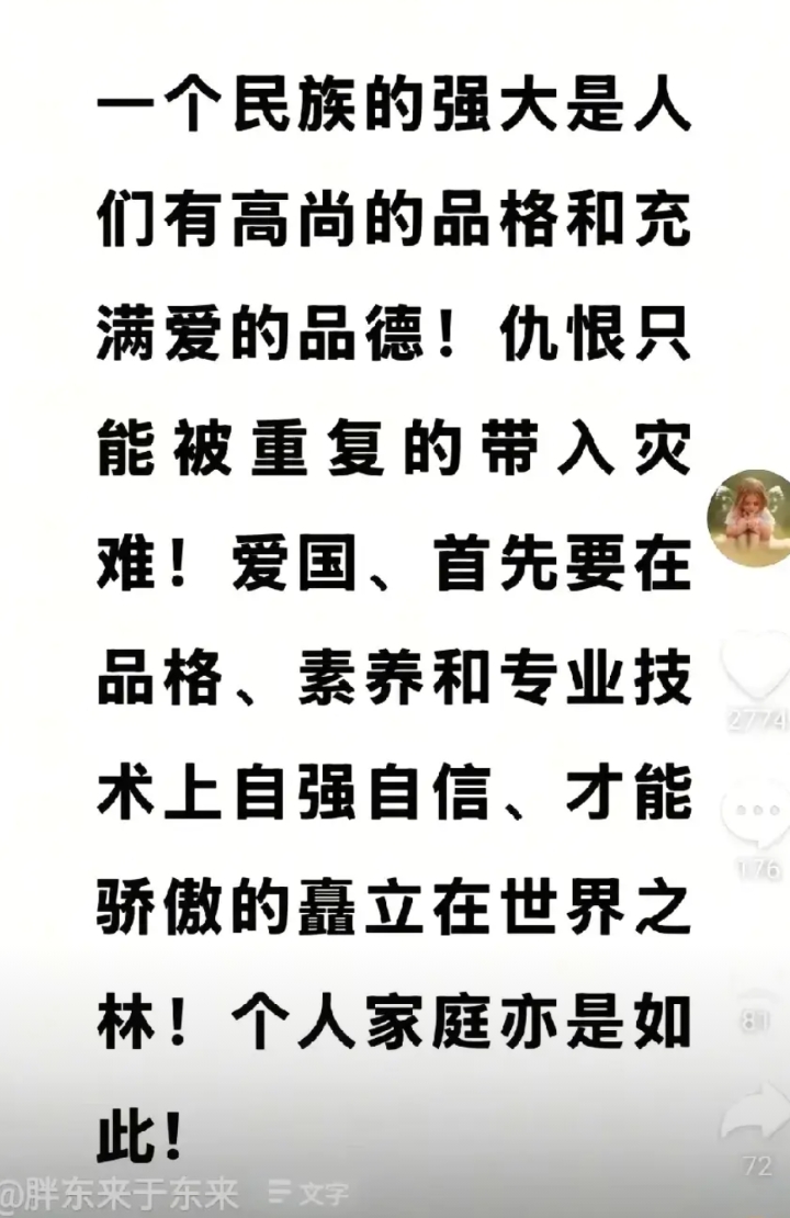 东来老板真敢说!网友请他替《731》发声,他说“世界有数不清的仇恨,传播美好比传播仇恨更能让人走向光明!”乍一听好像挺有道理,但作为一个正常人真能这么做吗? 抗日战争造成3500万伤亡,怎么能忘怎么敢忘?没有他们付出生命守住家园哪还有现在的中国?忘记他们意味着背叛民族!《731》不是传播仇恨,而是让大家忆苦思甜守住本心砥砺前行。 另外中华民族是世界最友善的民族,近代矗立世界之巅的西方帝国扩张之路可是充满了野蛮掠夺。 不知道东来是没读过世界历史还是忘乎所以!公众人物发言需警慎,否则建议退网好好做企业。