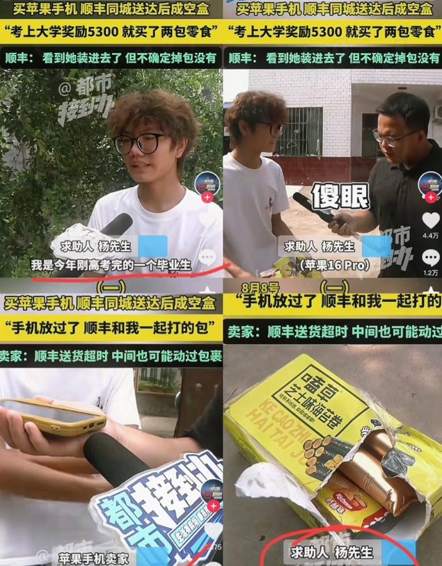 8月8日,河南许昌一小伙,在闲鱼上5300买了一台苹果16pro,结果顺丰配发当面验货,拆开包裹里面却是两包零食。