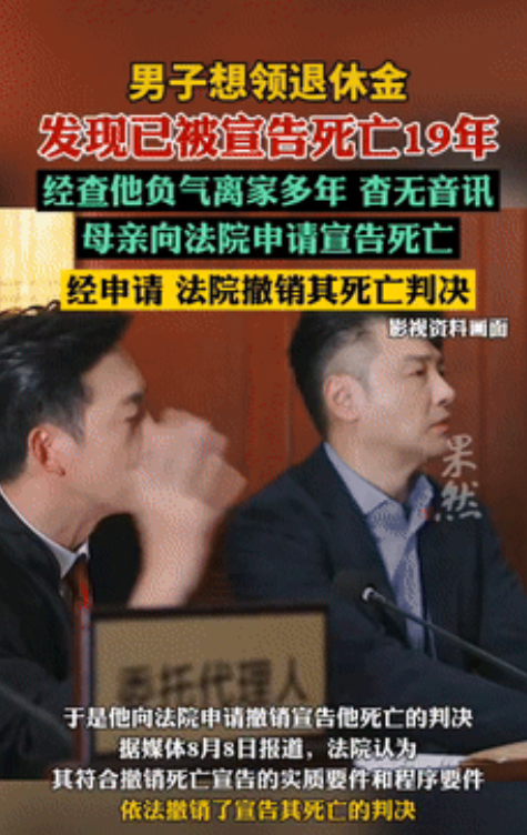 太离谱了!江苏无锡,一男子因到退休年龄,回老家想办理养老金领取手续,没想到,却发现自己竟被宣告“死亡”,户籍早就被注销了,然而,在了解到事情真相后,男子傻眼了! 根据零距离视频8月10日的消息,事情得从多年前说起。1995年,江苏无锡的陶某与妻子钱某感情走到尽头,在法院调解下离了婚。 离婚后的陶某,心情糟糕透顶,一气之下选择离家出走,这一走,便如人间蒸发,多年来毫无音信。 家人四处打听寻找,托亲戚、问朋友、找熟人,能想的办法都想了,可就是没有陶某的任何消息。 时光匆匆,到了2005年3月,陶某的母亲马某实在等不下去了,这都过去整整10年,儿子却依旧下落不明。 无奈之下,马某向法院申请宣告陶某死亡,法院也按程序办事,联合陶某所在单位、社区以及公安部门,进行一番核实,确认陶某确实已离家出走10年,毫无踪迹。 之后,法院依法发出寻找陶某的公告,按照规定,公告期为1年,可1年时间过去,愣是一点儿陶某的消息都没有。 于是,法院判决宣告陶某死亡,紧接着,公安机关也依规注销了陶某的户籍,日子就这么一天天过着,谁都没想到,到了2024年6月,陶某达到了退休年龄。 他想着该回老家办理养老金领取手续了,毕竟辛苦工作这么多年,也该享受应有的待遇,可当他满心欢喜回到老家办理手续时,却被工作人员告知,自己早在19年前就被宣告死亡,户籍也早已被注销。 这消息犹如一道晴天霹雳,把陶某给砸懵了,他怎么也想不到,自己在外辛苦打拼,老家竟发生了这样的事。 震惊过后,陶某迅速向法院申请撤销宣告他死亡的判决,法院在受理这个申请后,也不敢马虎,仔细询问了陶某以及他的母亲马某,通过多番查证,确认申请人就是陶某本人。 最终,法院依法作出了撤销死亡宣告的判决,陶某这才在法律意义上“死而复生”,这个消息一经传出,网友们纷纷热议。 有的网友说:“这事儿也太戏剧性了,搁电视剧里都不敢这么演。” 还有网友表示:“能理解陶某母亲当年的做法,10年都没消息,任谁都会绝望。” 也有网友提出:“这也反映出信息流通的问题,要是当年信息能更全面地共享,或许就能避免这种情况。” 这件事告诉我们,生活中充满了意想不到的变数,法律在处理这类事情时,有它既定的程序和规则,目的是保障各方面权益。 但对于个人而言,家庭关系的维系至关重要,陶某负气离家,没想到会引发这么大的变故,同时,也希望随着时代发展,信息共享能更加完善,减少这类因信息不通畅导致的离奇事件。 大家对此事怎么看呢?欢迎在评论区留言讨论。