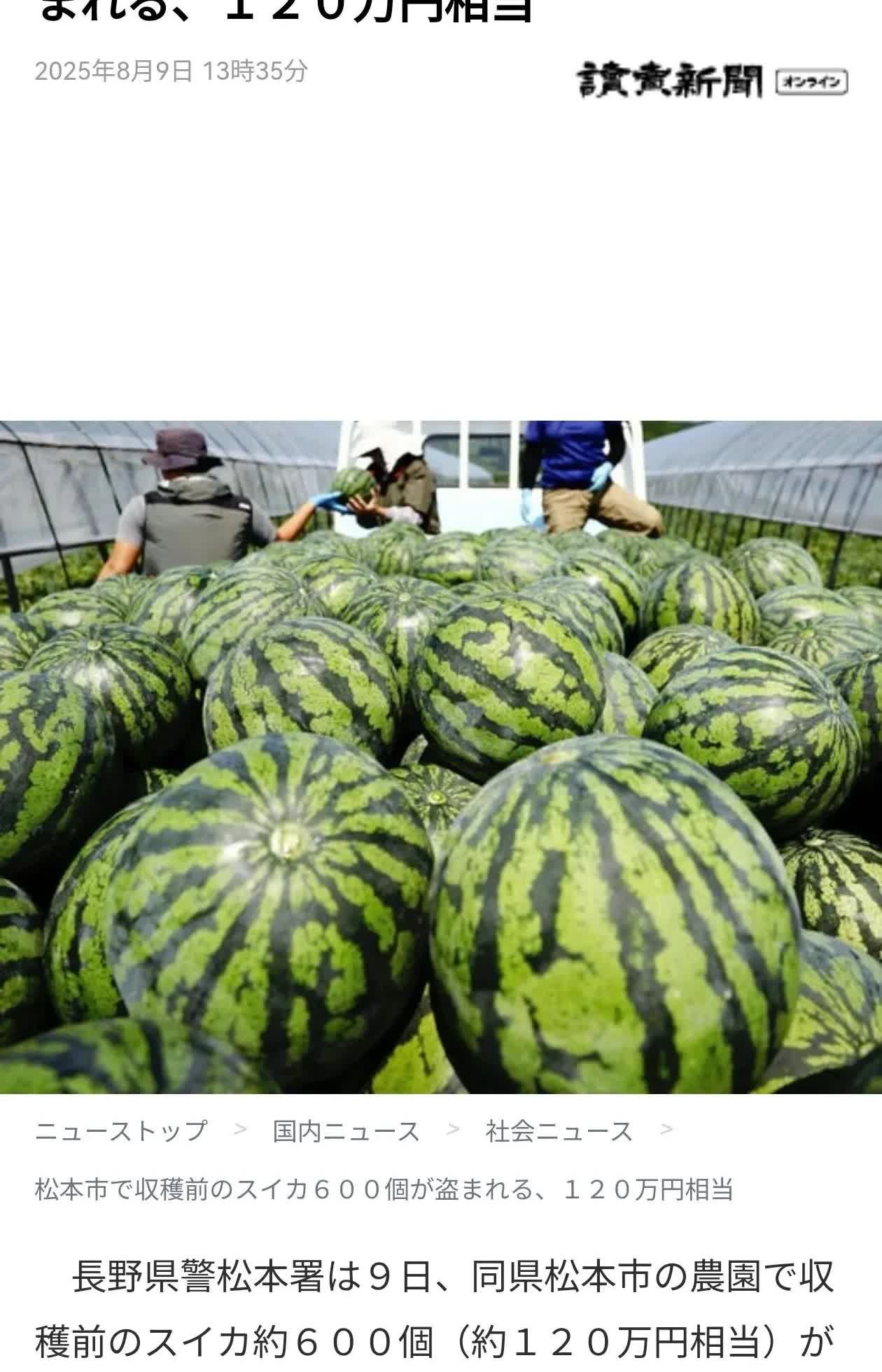 日本长野县发生一起重大盗窃事件。 一户农民的600个西瓜被盗。由于被盗物品金额达到了120万日元(约6万人民币),所以当地警方将此案作为重大案件。目前正在调查中。