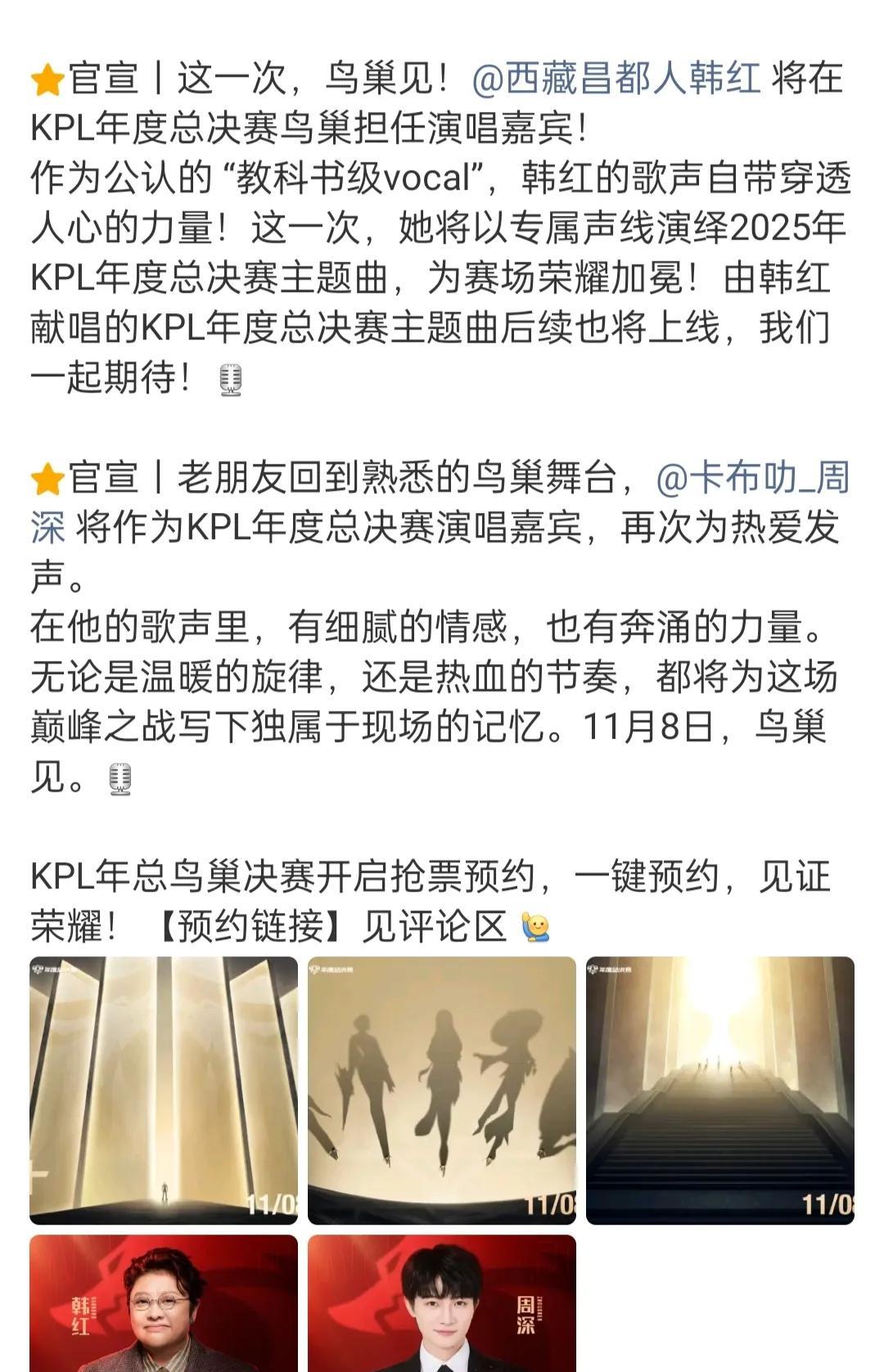11月8号与周深相约鸟巢! 2024年的KPL主题曲《看见我》也是周深演唱的,特别燃的一首歌! 小王的场地也是越铺越大了,去年在工体,今年在鸟巢去了! 去年周深演唱了四首歌,不知道今年有几首,来都来了,多唱几首[呲牙] #周深#