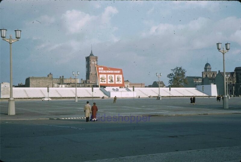 1958 年,东德,广场上高高挂着马克思恩格斯和列宁的画像。