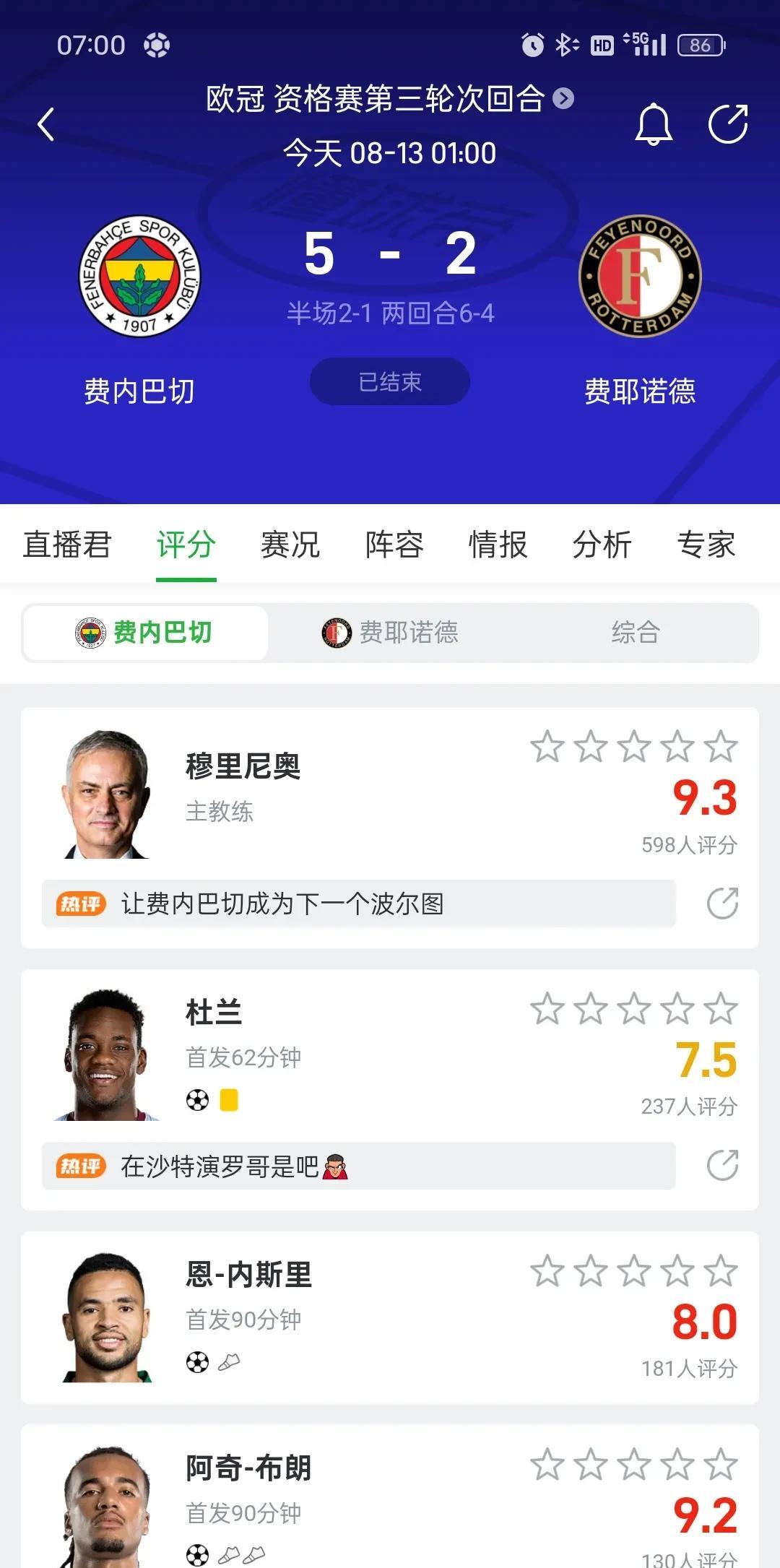 恭喜伟大的前#国米#教练何塞·穆里尼奥,他率领土耳其的费内巴切在欧冠预选赛中淘汰了上一届欧冠16强、曾经击败AC米兰的费耶诺德队。两回合共攻入6球,这也让大家看到老帅正在积极拥抱时代的攻势潮流。 下一场对阵本菲卡,要是能够获胜,那也算是一个奇迹了。