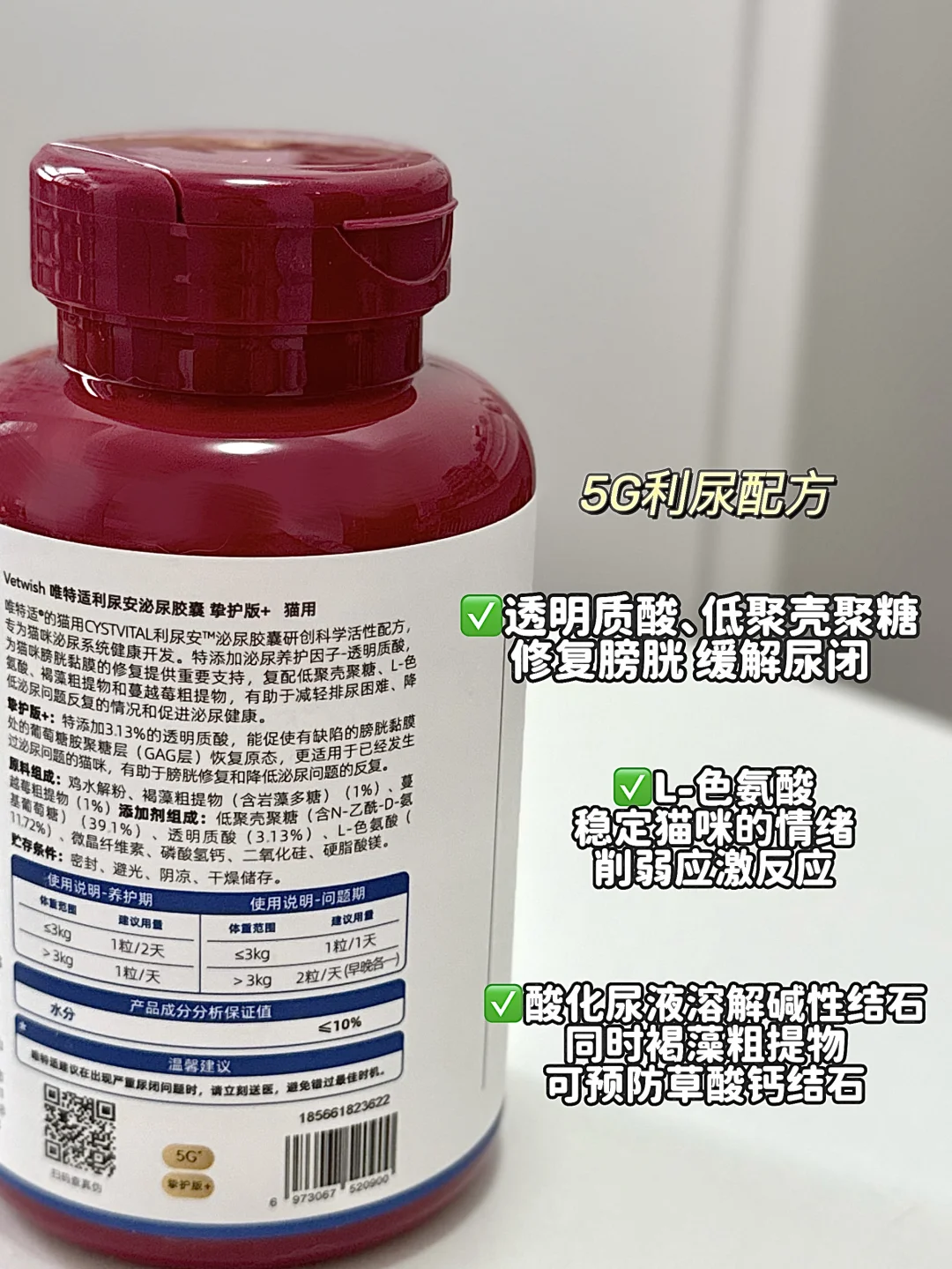4.修护类营养品定期吃。我喂的是vetwish的利尿安,可以修护猫咪膀胱黏膜,保护泌尿系统。每天拌在主粮或湿粮里不影响适口性,不像喂药那么困难,养护好了后期就能降低复发的概率!。l-色氨酸还可以帮助舒缓猫咪情绪 。长期养护吃避免尿闭反反复复!