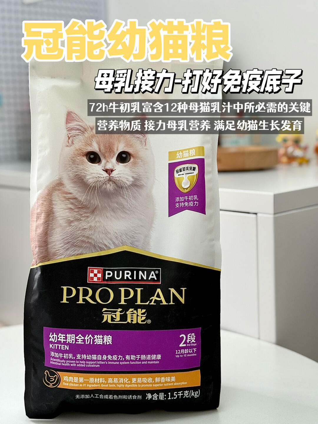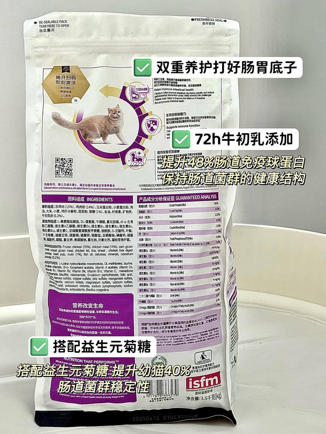 我选择的是🐱【冠能幼猫粮】,我最看重的就是它是72h牛初乳的幼猫粮,富含免疫球蛋白等天然活性物质和粗蛋白、精氨酸、牛磺酸等12种母乳乳汁中的必需的营养元素, 接力母乳营养,填补幼猫断奶后的免疫空白。牛初乳还能激活幼猫肠胃免疫,提升幼猫肠道免疫球蛋白A数量,保持肠道菌群的健康结构,让肠道保持健康的状态,减少软便和肠胃应激。再搭配益生元菊糖维稳,这就打好幼猫肠胃底子啦,让幼猫更好地吸收营养,促进幼猫生长发育,长期吃能明显感觉到小猫长肉速度很快,而且体质很好