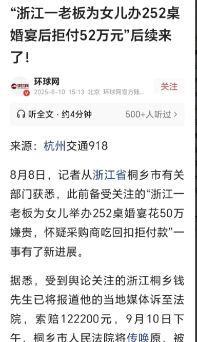 据环球网报道,一老板办婚宴252桌,办完后拒付52万。