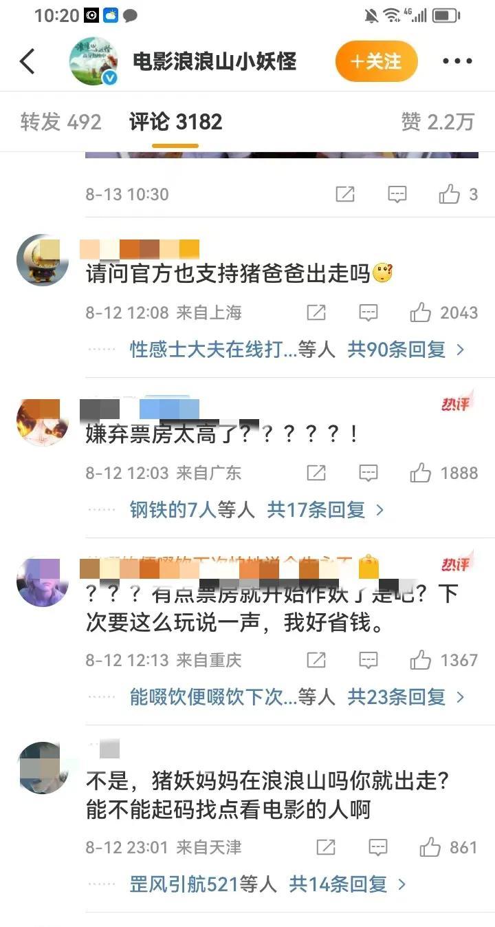 没成想找了两个人宣发电影,出现了这样的结局。 《浪浪山小妖怪》因为请了傅首尔和苏敏推广这部动画片。 评论区彻底沦陷了。 甚至有的网友评论说,是不是嫌电影票房太高了?所以请这样的人来宣传。 现在这部动画片的票房还很高,已经七亿多了。看见网友这样的评价,但是官博并没有删贴处理。#浪浪山票房#