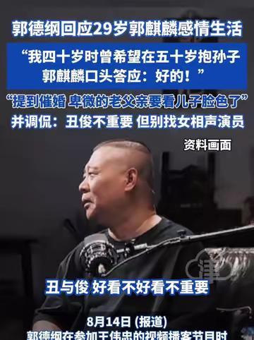 近日,相声界大咖郭德纲在参加台湾主持人王伟忠的访谈节目时,再次提及催婚儿子郭麒麟一事,直言希望能在 50 岁抱上孙子。 说起催婚,郭家可是全家总动员。不仅爷爷辈亲自下场,郭德纲本人更是曾放出“大招”。 在节目中向孟非提亲,豪言要用“北京三套四合院+2.6亿”作彩礼,这为抱孙子的疯狂劲儿也是没谁了! 可这边老爹急得团团转,那边“大林子”郭麒麟的事业却一路狂飙。 从《庆余年》的范思辙,到《赘婿》的宁毅,再到《平凡之路》的潘岩,部部是爆款,圈粉无数,已然是95后小生中的佼佼者。 事业得意,情场却成谜。大林子,全网可都等着你官宣呢!你可得抓紧啦,不然老郭50岁抱孙的KPI可就悬了! 此前郭德纲也表明,对儿媳妇长相不在意,只要不是说相声的就行。 看来,郭麒麟的感情走向,依旧备受大众瞩目,不知何时能满足郭德纲 50 岁抱孙子的心愿,也让爷爷能早日抱上重孙 。