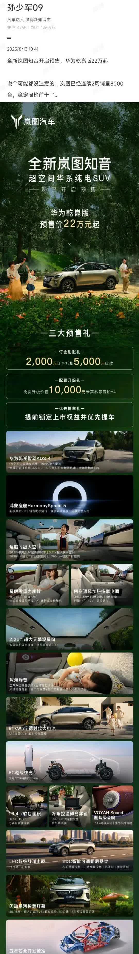 搭载华为乾崑版的岚图已经连续2周销量3000台,稳定周榜前十了! 别的不说,岚图的节奏把控的真好,梦想家火了后,free+接棒,free+火了后,知音接棒,还有追光L、泰山等着接棒,爆款一款接一款,节奏一波接一波 同时岚图的成功也向大家证明了一点,华为的科技对于车辆是一种助力,类似于好上加好,所以抱华为大腿的前提是,你的车其他方面都好就差一个科技属性,但如果你其他方面拉胯,那么这个科技属性就无法给你什么加成了,车好是前提,科技好是附加值 大家怎么看?